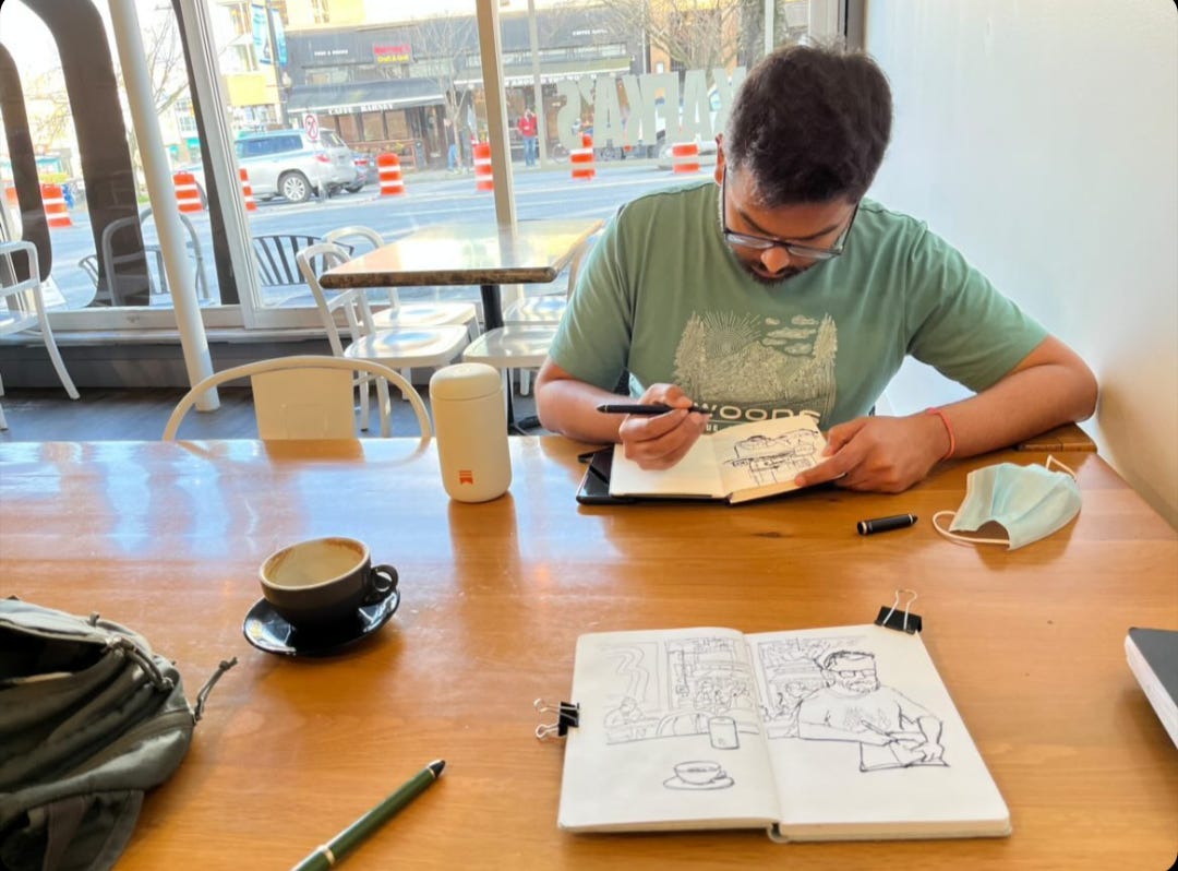 Observe, a SneakyArtist hunched over his sketchbook. Observe his coffee, black, in a special thermos (thanks, Substack!) so it stays warm even when neglected completely. Observe the singular weapon of choice, a fude nib fountain pen. Observe the furrowed brows, and the hint of a Resting Grumpy Face.