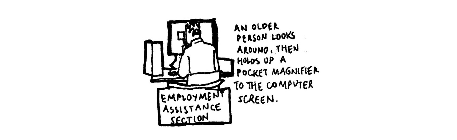 He looked to his right, then to his left. Then he fished the small magnifying glass out of his shirt pocket and held it up before him. This happened when I was halfway through drawing him, and, at first, I did not know what he was doing. Then I noticed the glass move from left to right, line by line, as he leaned forward.