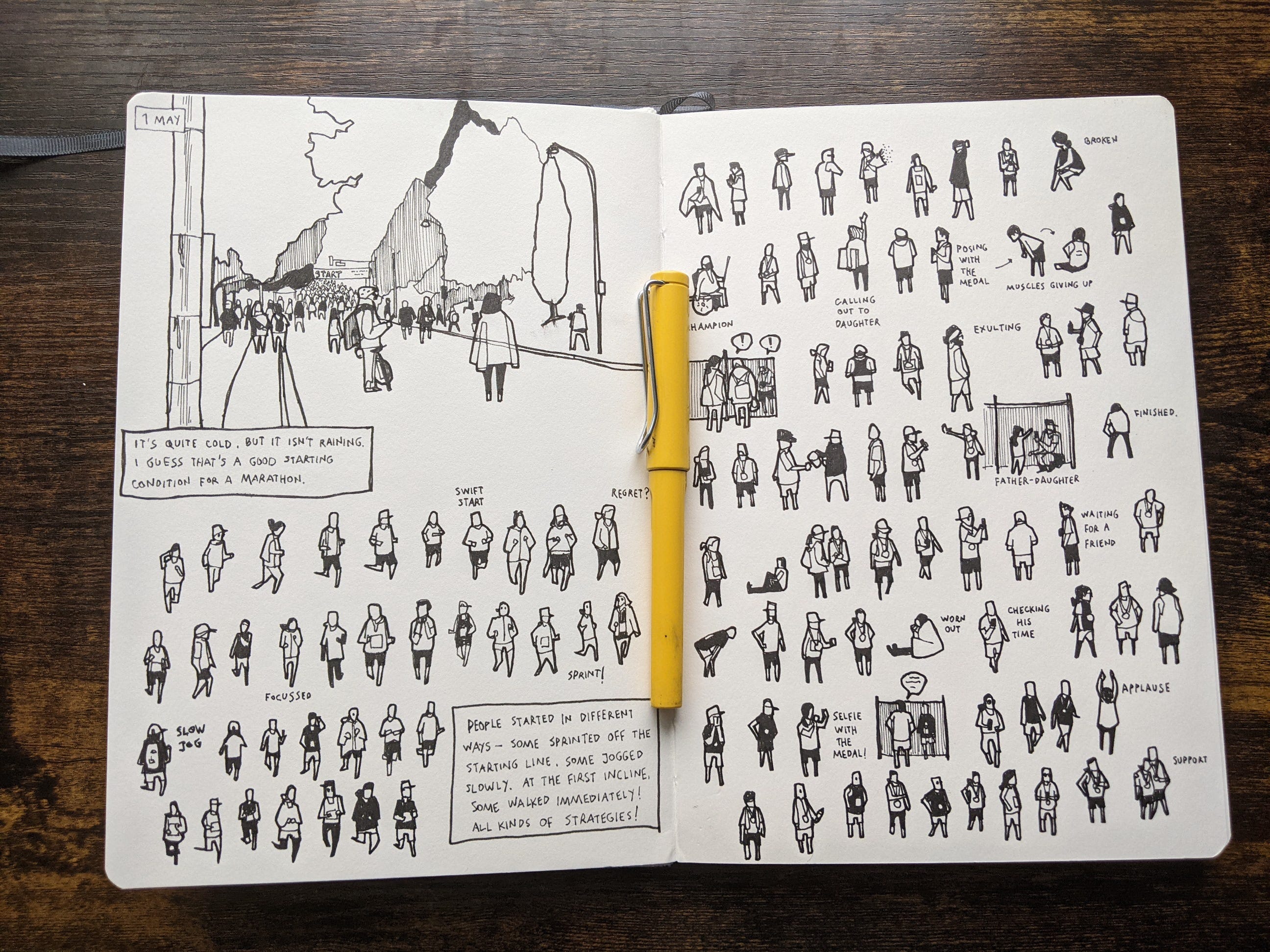 This Sunday was the 50th Vancouver Marathon. I went to the starting line early in the morning to watch the runners set off (left page). Then I visited the finish line and post-finish area between the 3.5 hr and 4.5 hr marks to draw the runners with their medals (right page).