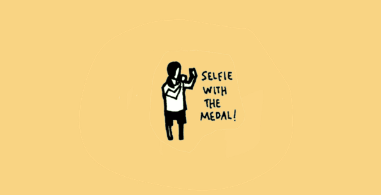 In the area beyond the finish line, I watched this finisher smile widely to pose with their medal.