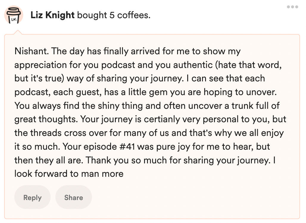 As an independent podcaster, I am grateful to have listeners who engage with my work so deeply. Thank you, Liz!