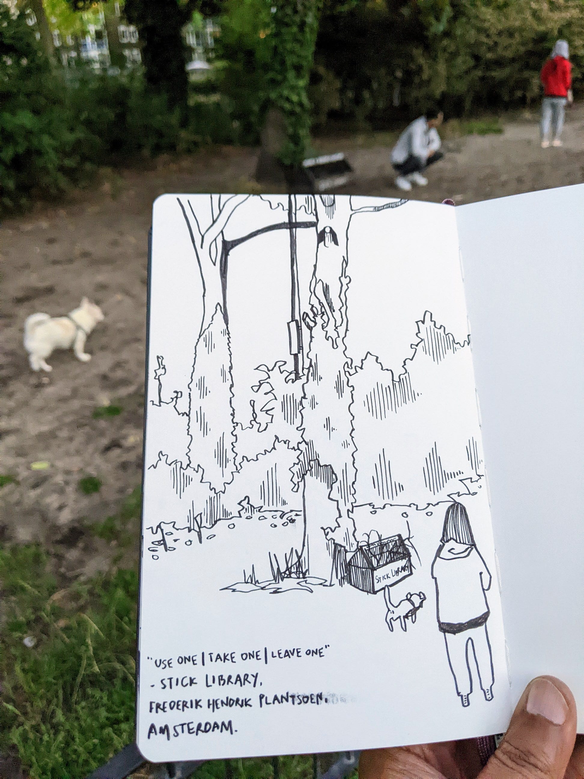 We were passing through Frederik Hendrikplantsoen in Westerpark to an Italian restaurant for dinner. That’s when I saw the sticks library. You know the rule. I had to stop for a drawing.