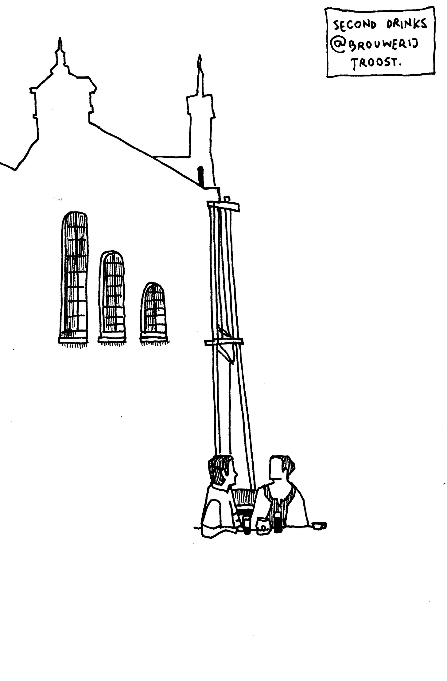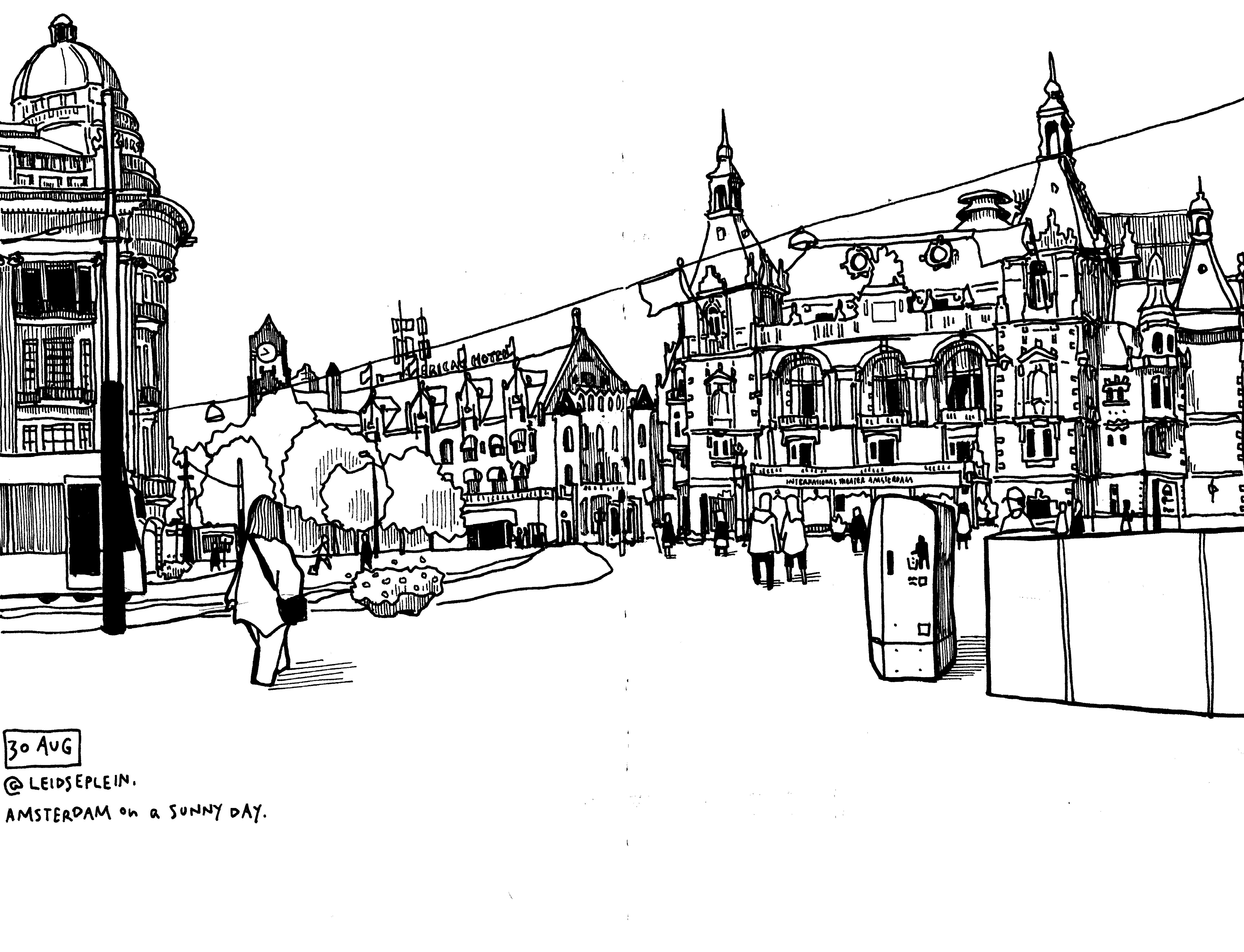 At Leidseplein, watching a train emerge from the space between two buildings, I decided to take on Dutch architecture head-on. Straight to ink. Left to right.