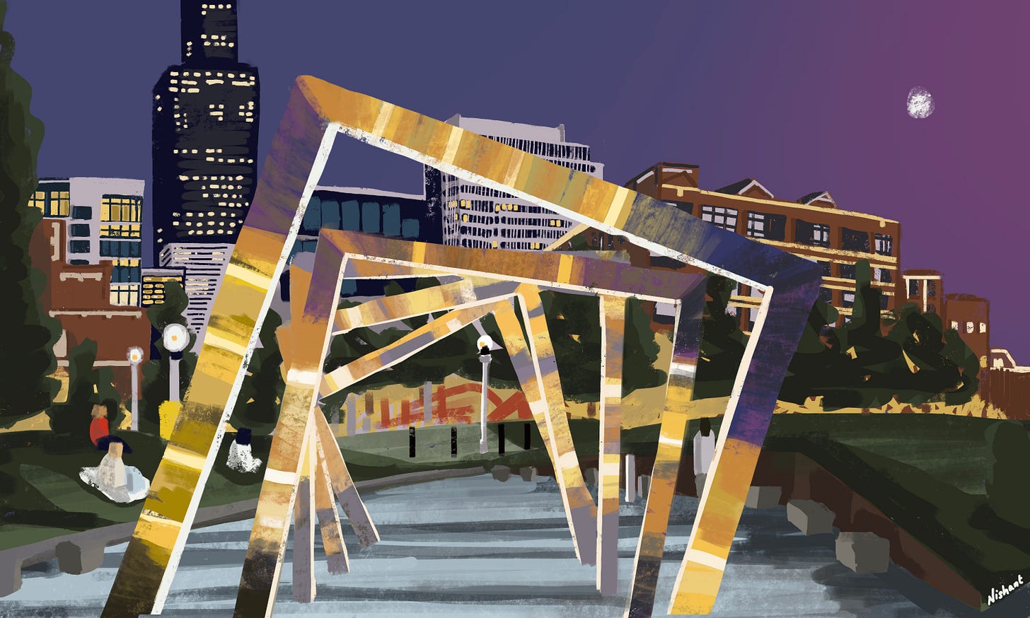 I made a painting of a park in Chicago’s West Loop neighborhood. The digital medium allows me to work in a completely different style from my “pen and ink” work. I take such commissions as a useful opportunity to break out of my typical routine and think in shapes and colors, instead of shadows and lines. It’s an important distinction, which I discuss in detail in this podcast episode with Shari Blaukopf. If you’d like to see how it plays out in this piece, watch the video below.
