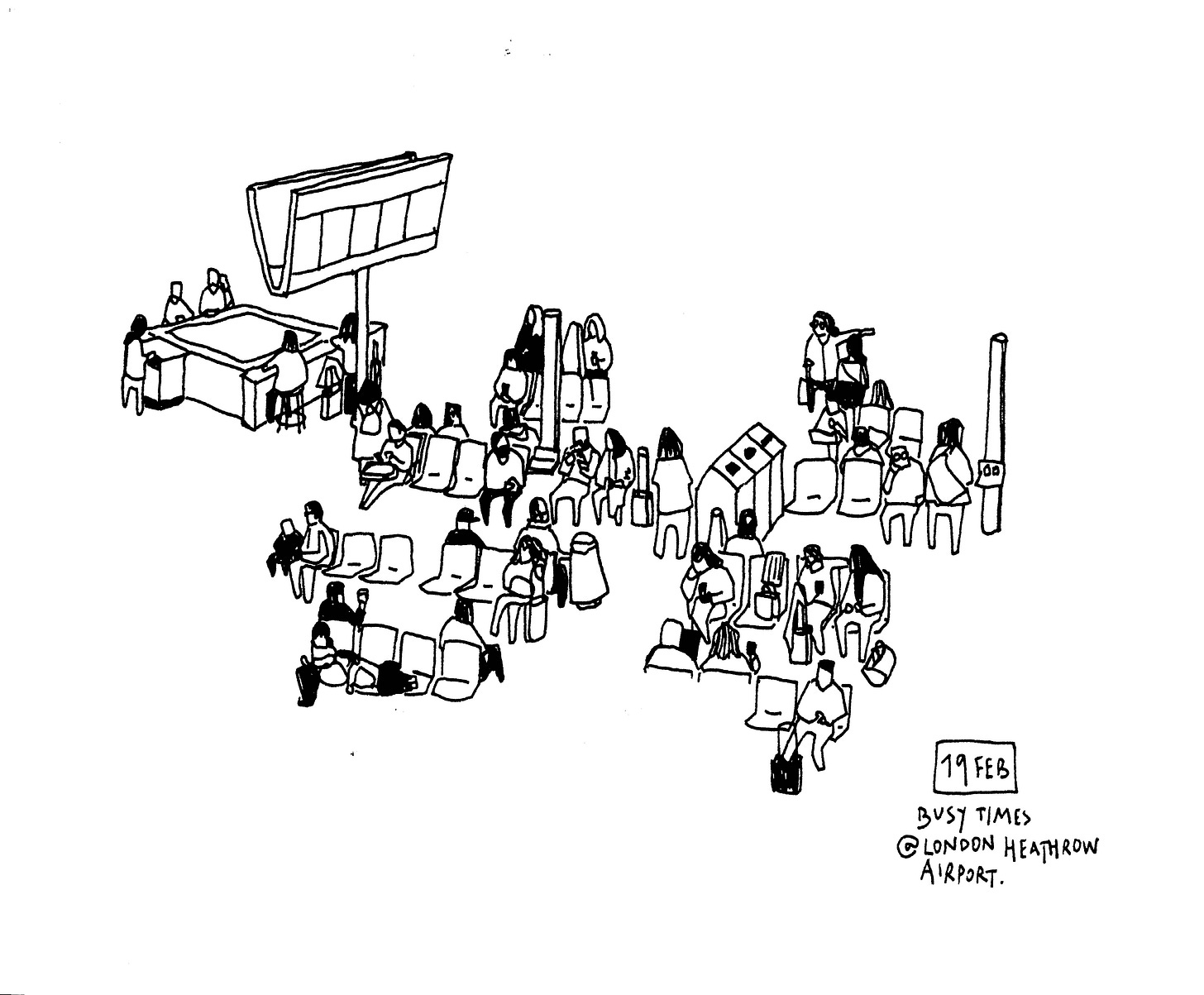 Last week I invited readers to write a tiny story for the people I found at Heathrow Airport. I received many lovely stories that gave life to my simple drawing.