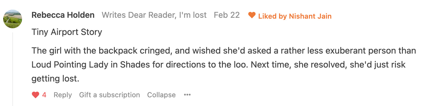 Congrats to Rebecca Holden! I love her “Dear Reader, I’m Lost” substack. More tiny stories that add up to a whole lot. And is there anything in life that isn’t a tiny story, at heart?