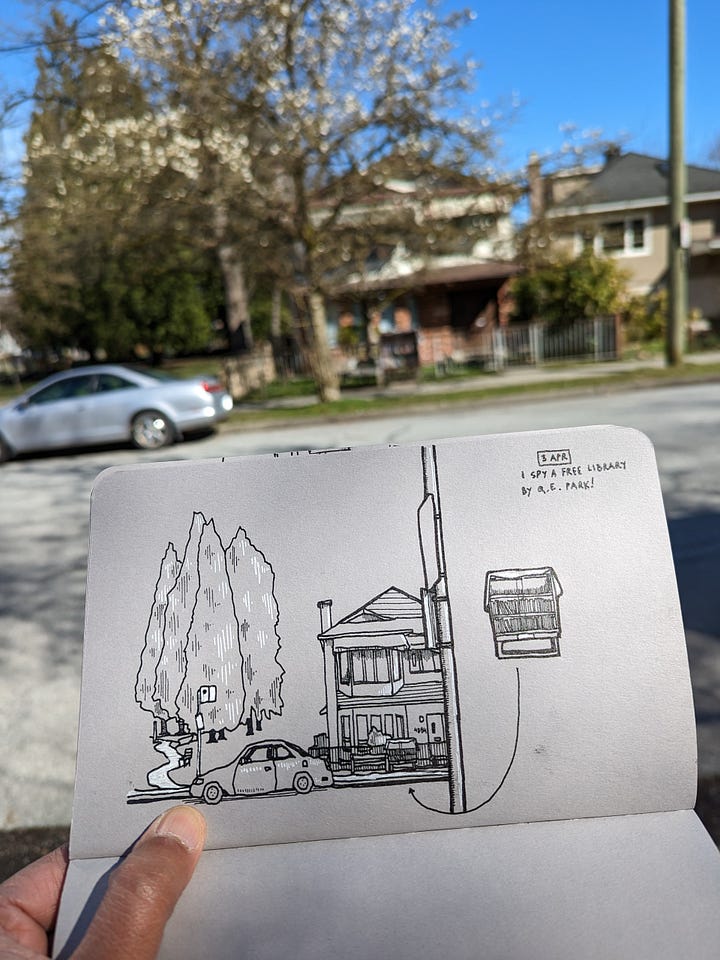 On the second occasion, I did not have a postcard to leave inside. So, I made up another rule instead - In the absence of something to leave inside, I make a drawing of the library.