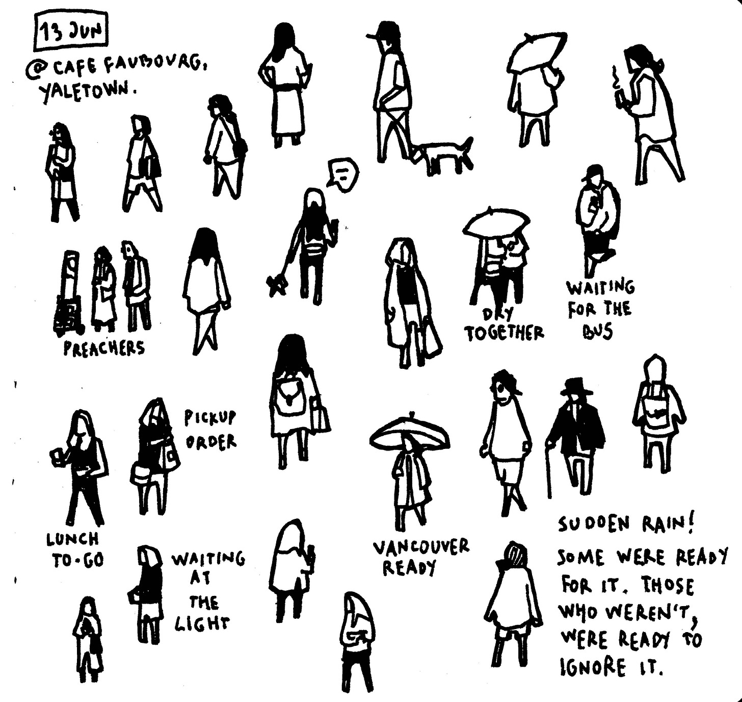 Sketchbook in hand, I took a patio seat in the Yaletown neighbourhood of Vancouver, watching people enter and exit the SkyTrain station. An excellent cappuccino sat beside me. Then suddenly, it began to rain.