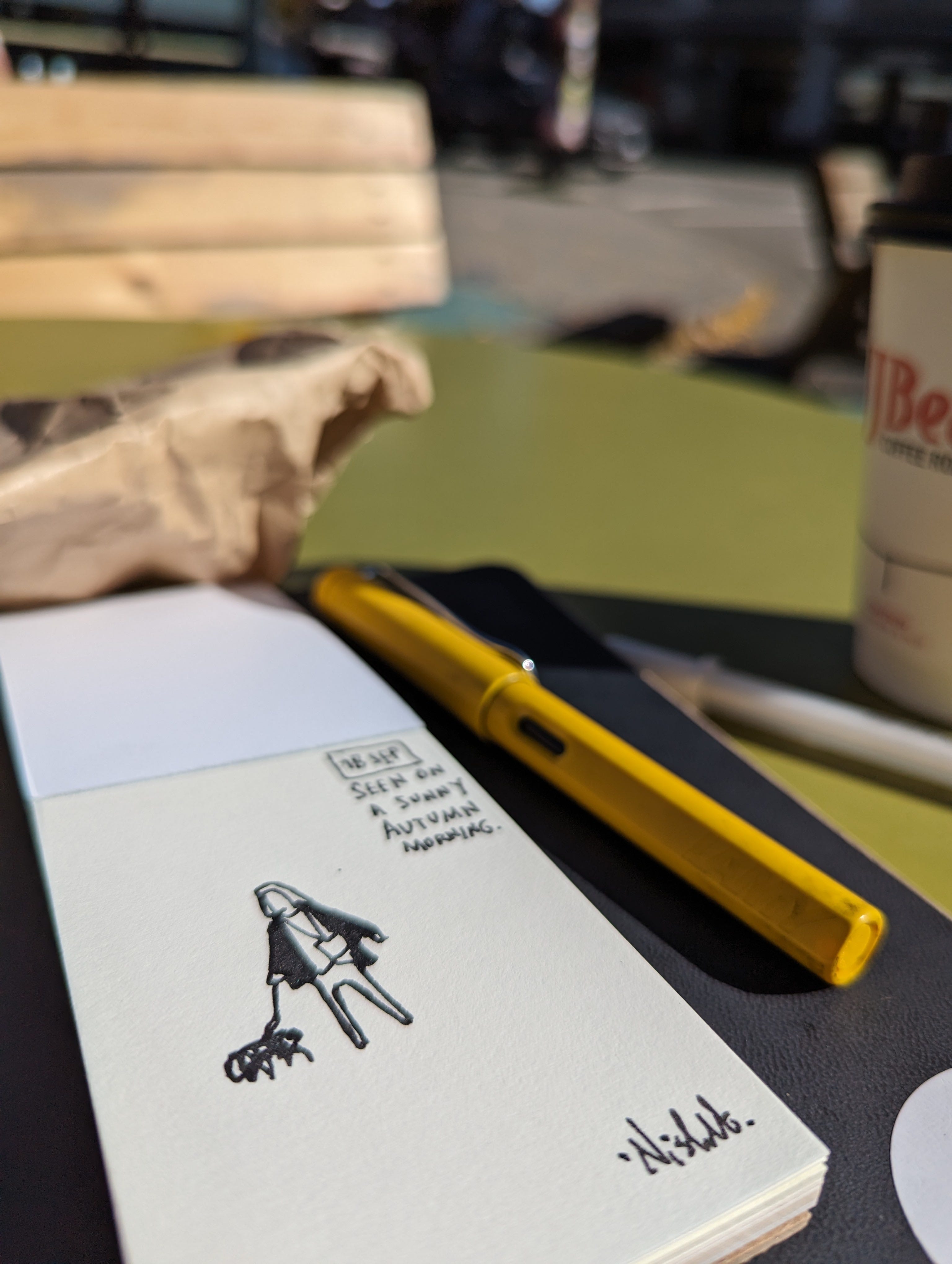 After the page was complete, and my coffee too, I made a tiny drawing to leave at a Little Free Library nearby. I decided that I would draw the next person to stop at the traffic light.