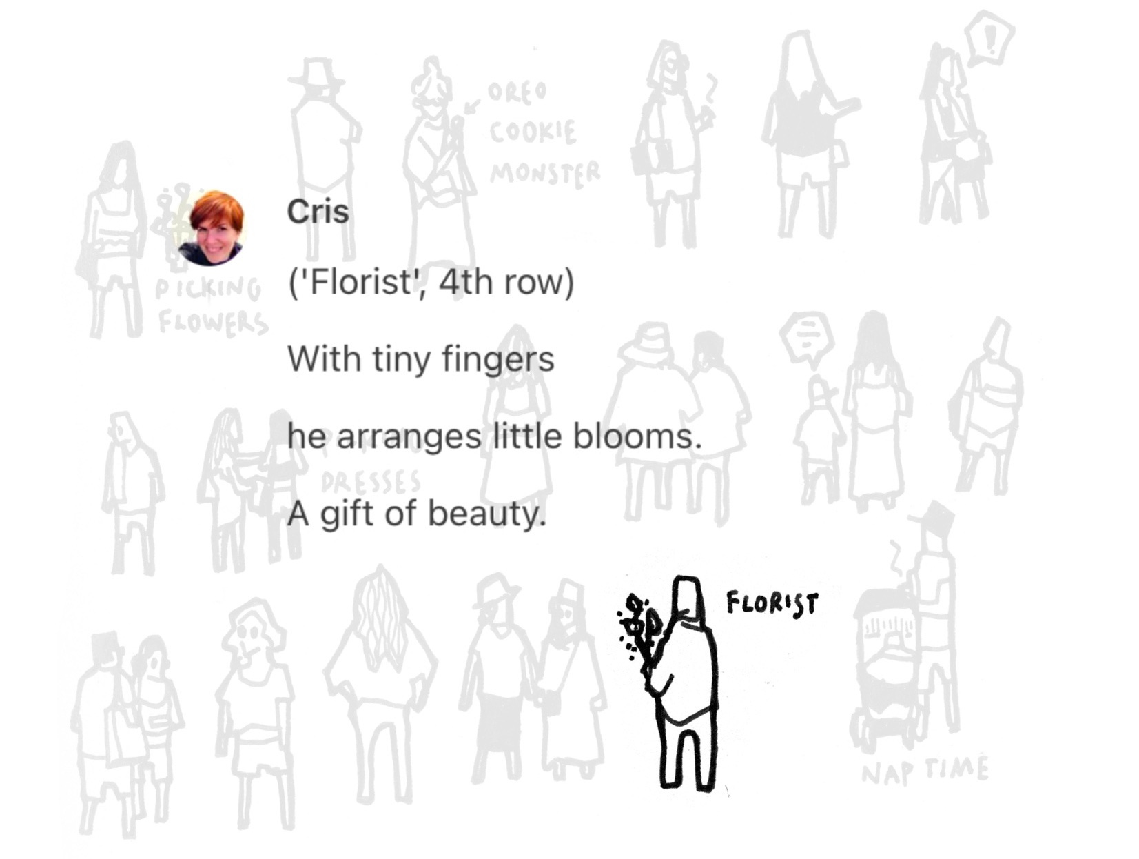 Tiny people are the countless, anonymous individuals who pass through our worlds everyday. They are the people sitting with us in the same trains, walking on the same streets, eating at the same restaurants. For a short period of time, day after day, their world intersects with ours. Even though we do not know them at all, tiny people play a very important role in our world. Tiny people populate our world, just as we populate theirs.