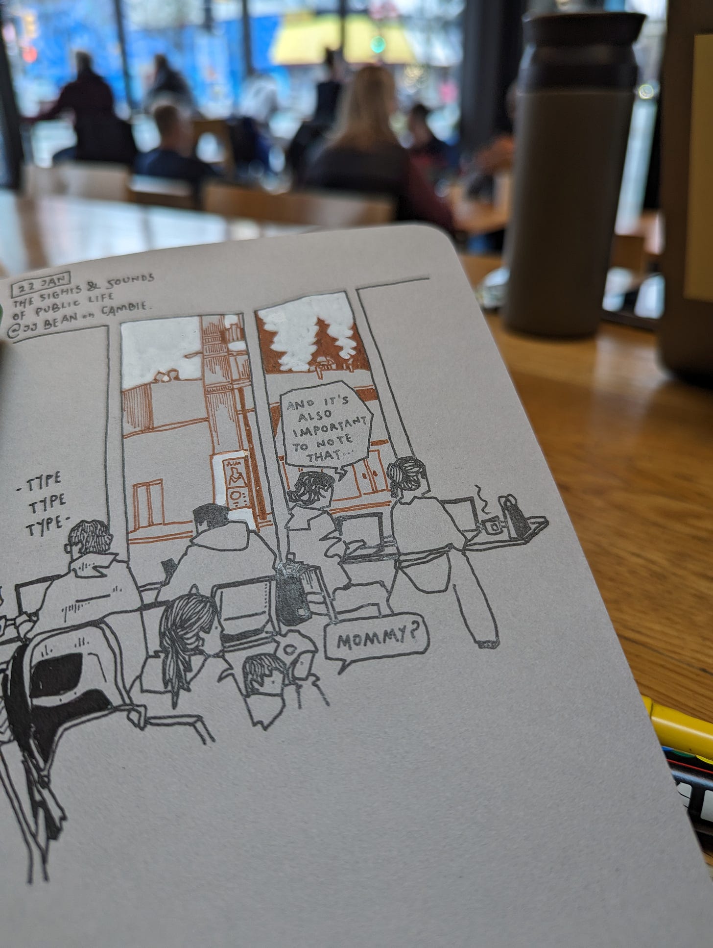Seeing a brief lull in proceedings, I walked to the neighbourhood cafe to re-immerse myself in the sights and sounds of public life.