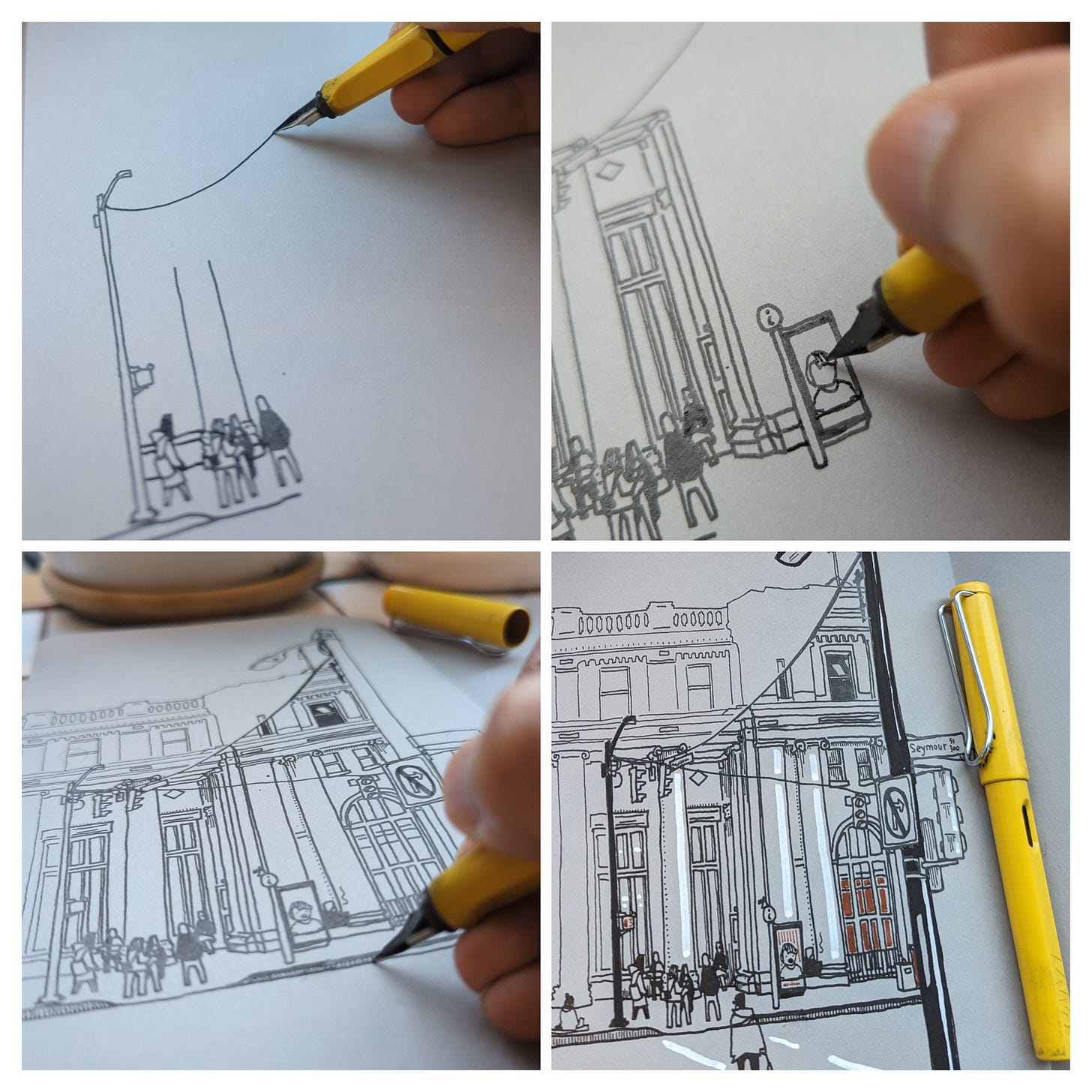 If you observe anything carefully, other things fade away. This is the nature of concentration. For a while, as I followed the lines from the window to my page, I forgot about my coffee, rapidly cooling. The voices around me descended into white background noise pierced by occasional laughter and the sound of steam escaping the espresso machines. The grey sky and rolling clouds of white, the architectural ornamentations of the station entrance, the vehicles on the road, all fell into the same pit of inattention. For the moment, they did not exist.