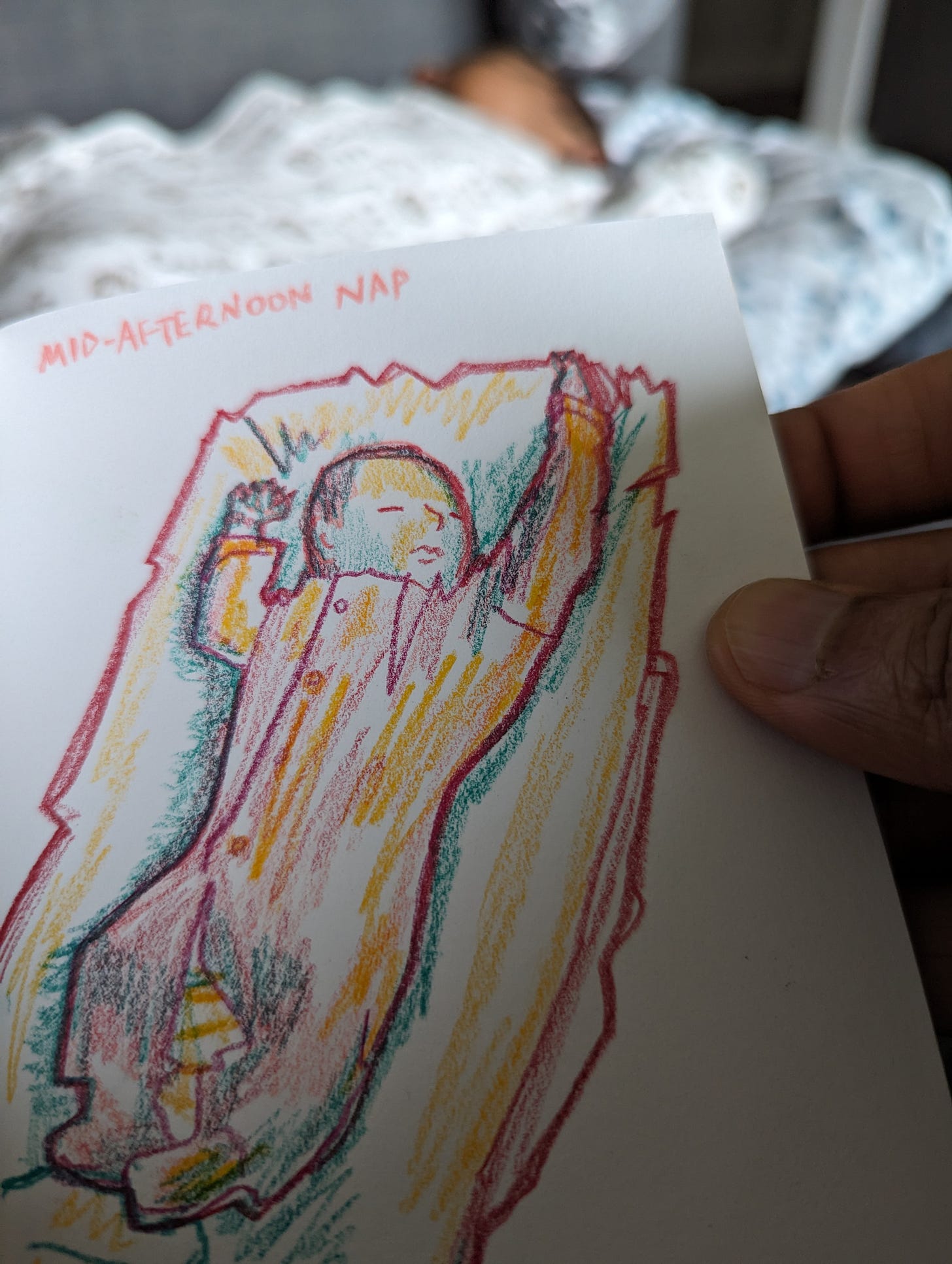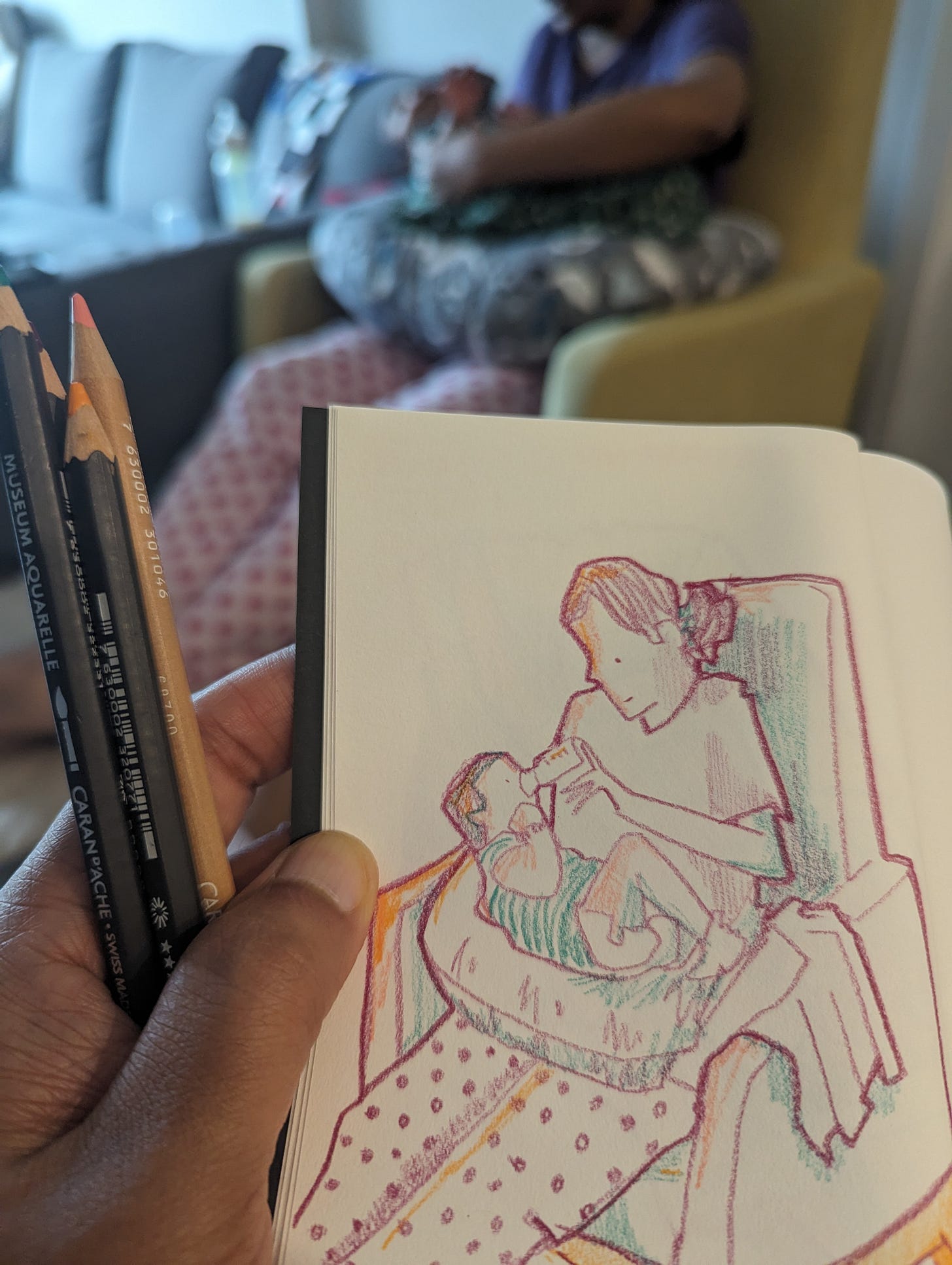 There are times when it is impossible to draw our tiny human. Such as at 5 am after a full feed as he groans and grunts before sinking back into sleep in my arms and I rock him on the rocking chair that soothes me as much as him. He has burped, and cleared his throat a few times, and wears a satisfied smile and beatific expression. But I cannot show you this moment because I could not have moved then. It was our private moment to share, together in the pre-dawn stillness of the world.