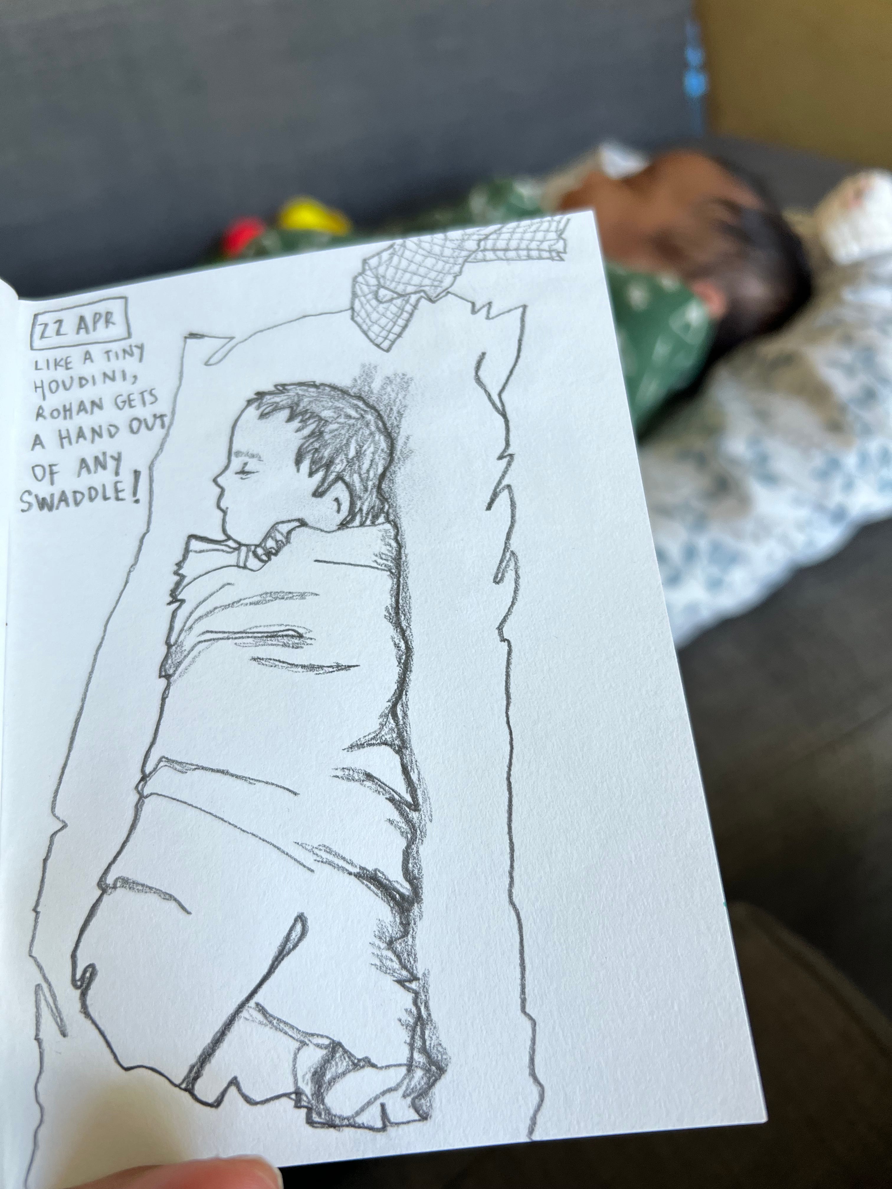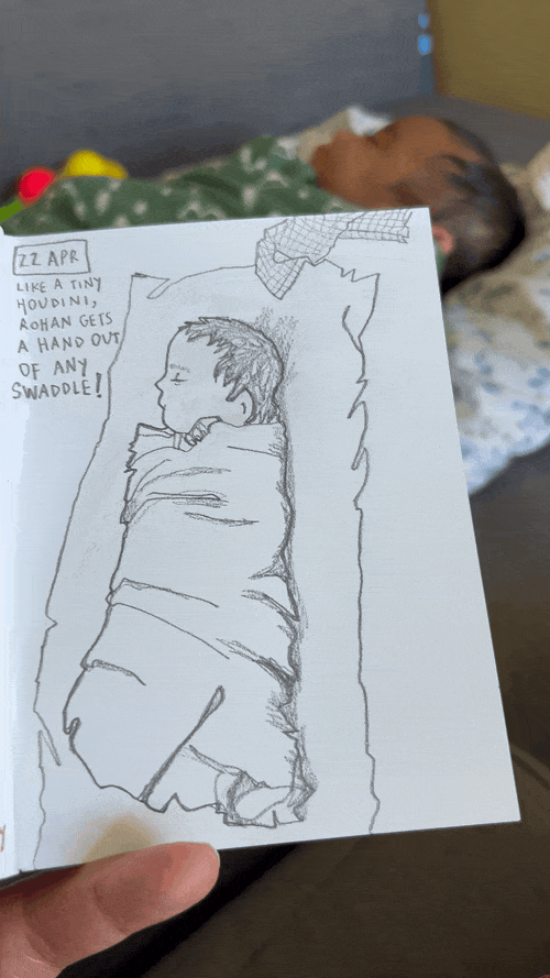 Watching Rohan sleep, and drawing him while he sleeps, is a unique joy of my life these days. A sketchbook is the excuse, really. An excuse to observe him deeply, and not just as a parent looking at their child.