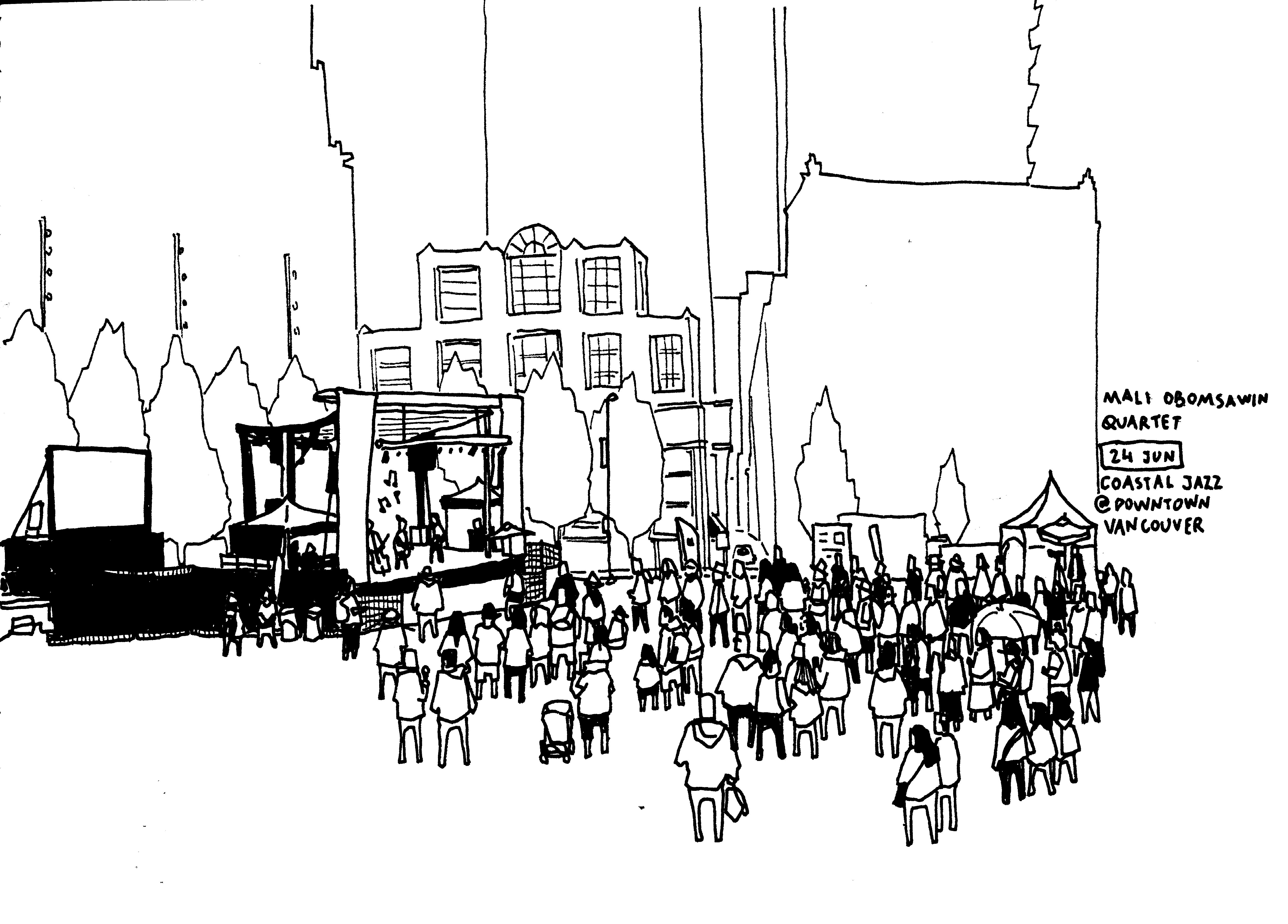 I opened the sketchbook with a drawing made at an open concert of the Coastal Jazz Festival in downtown Vancouver. The first people I drew on the page were on the left-most part of the crowd. By the time I reached the right side of the page, how many of those people were still in the same place? How many had taken their places even as I moved across the page? How many had left before I finished? Every element of this page was really there, every person doing the things, every tree, and window, and tent flap. But this moment is artificial, because of the process of observation and depiction over time.