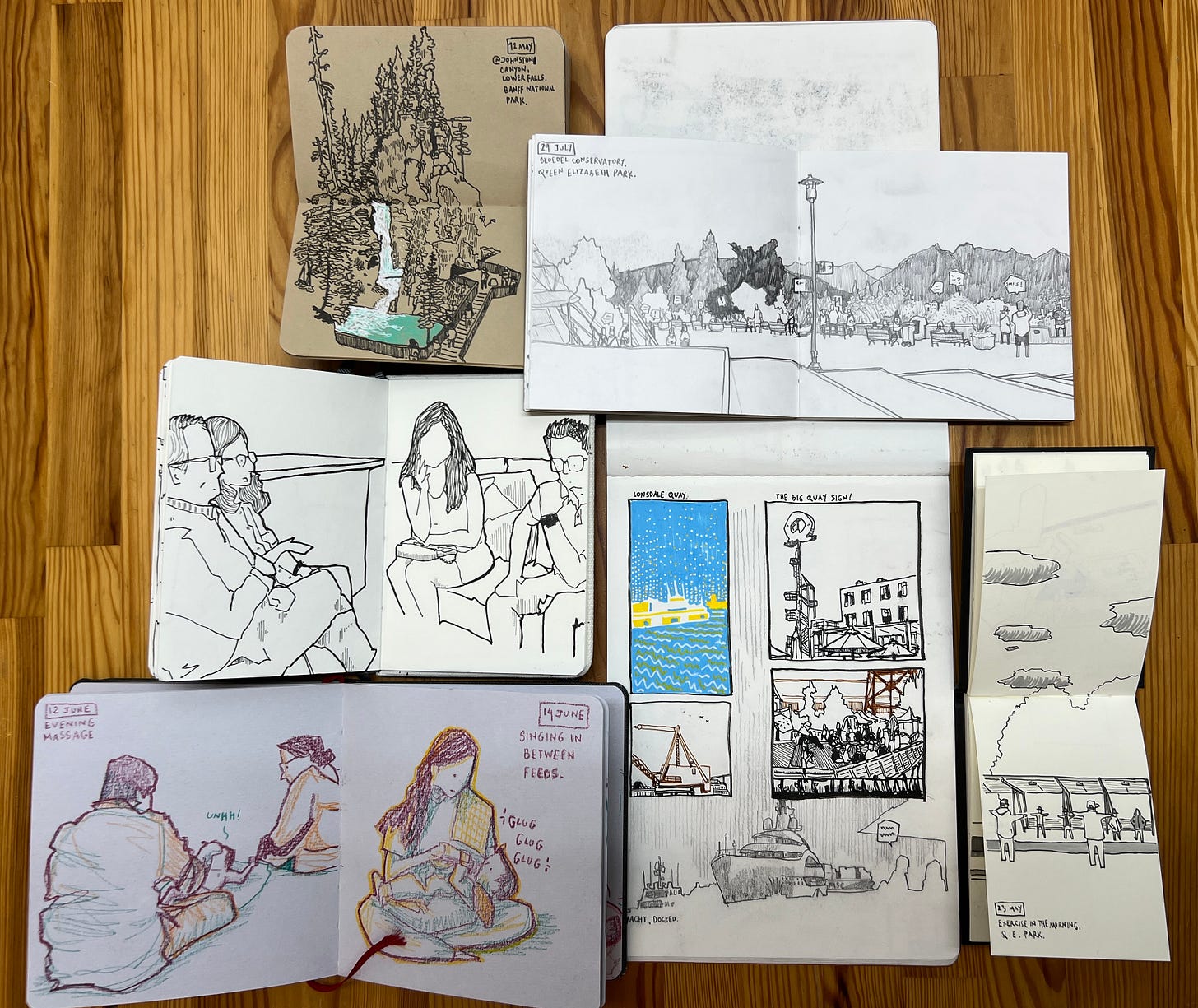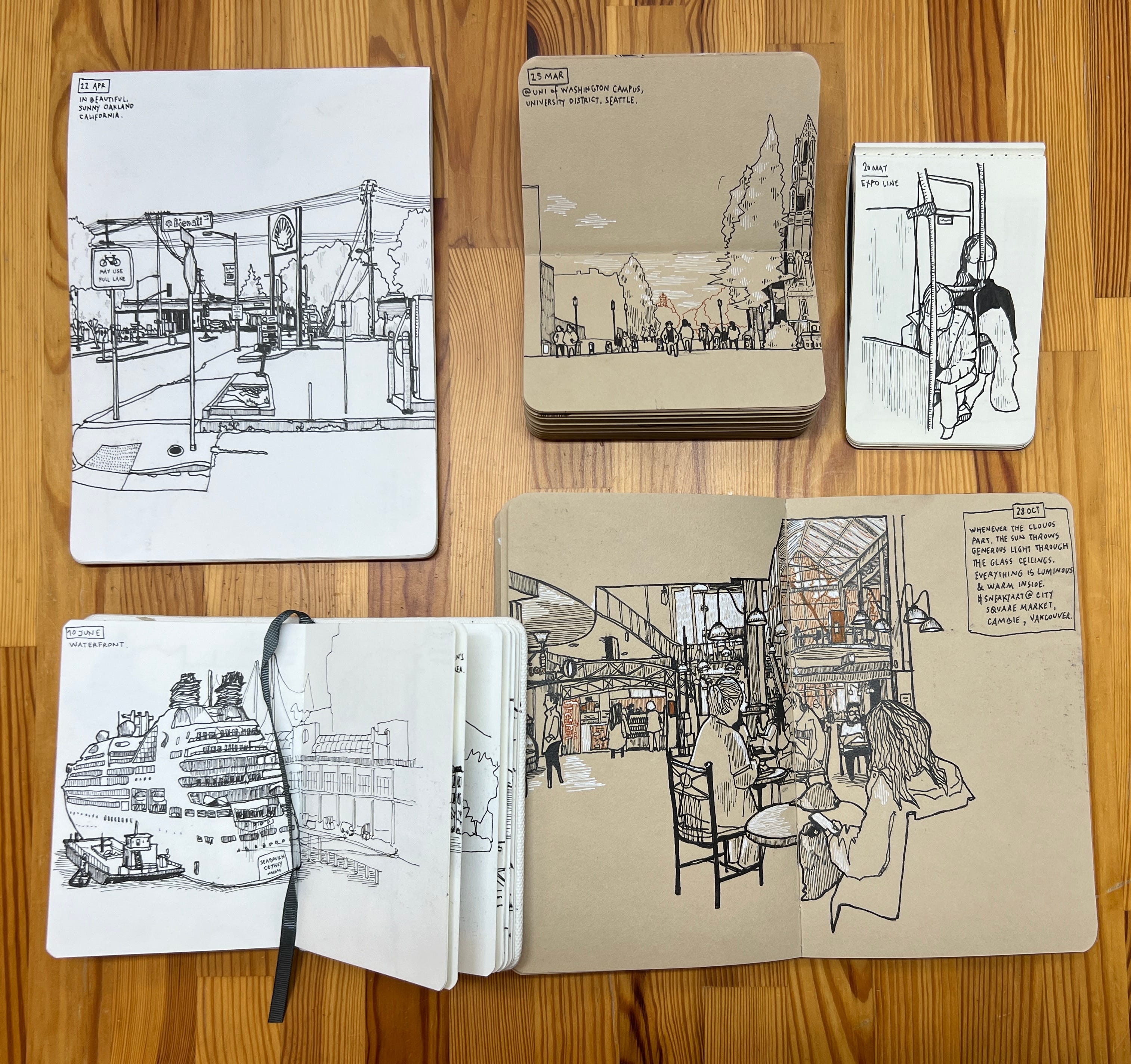 When you have only a few minutes on public transit, drawing is a less intimidating prospect with a pocket-sized sketchbook (top right, above). Large scenes with lots of details, but in situations where you also have time, tend to go in larger sketchbooks (bottom right, top left).