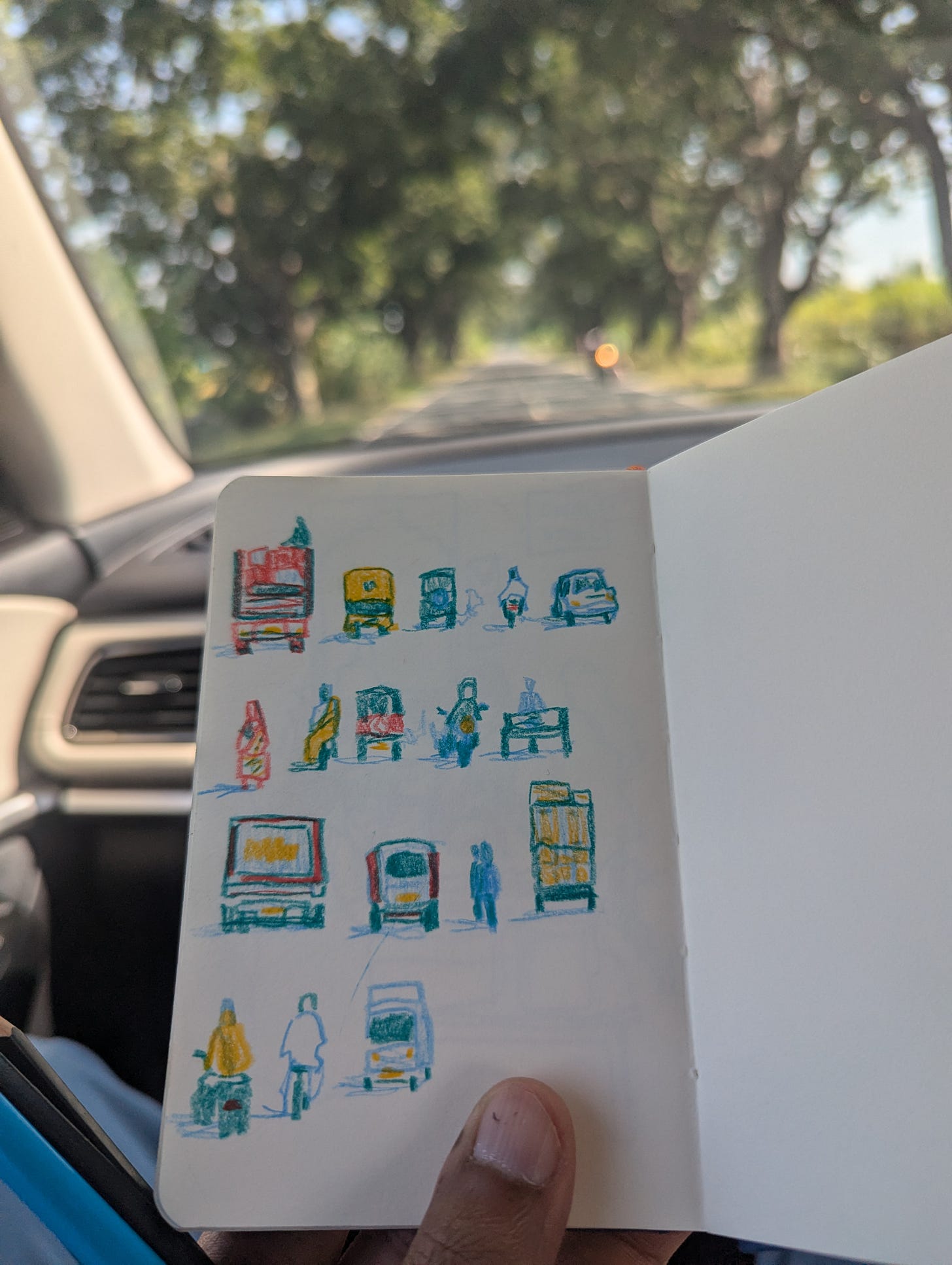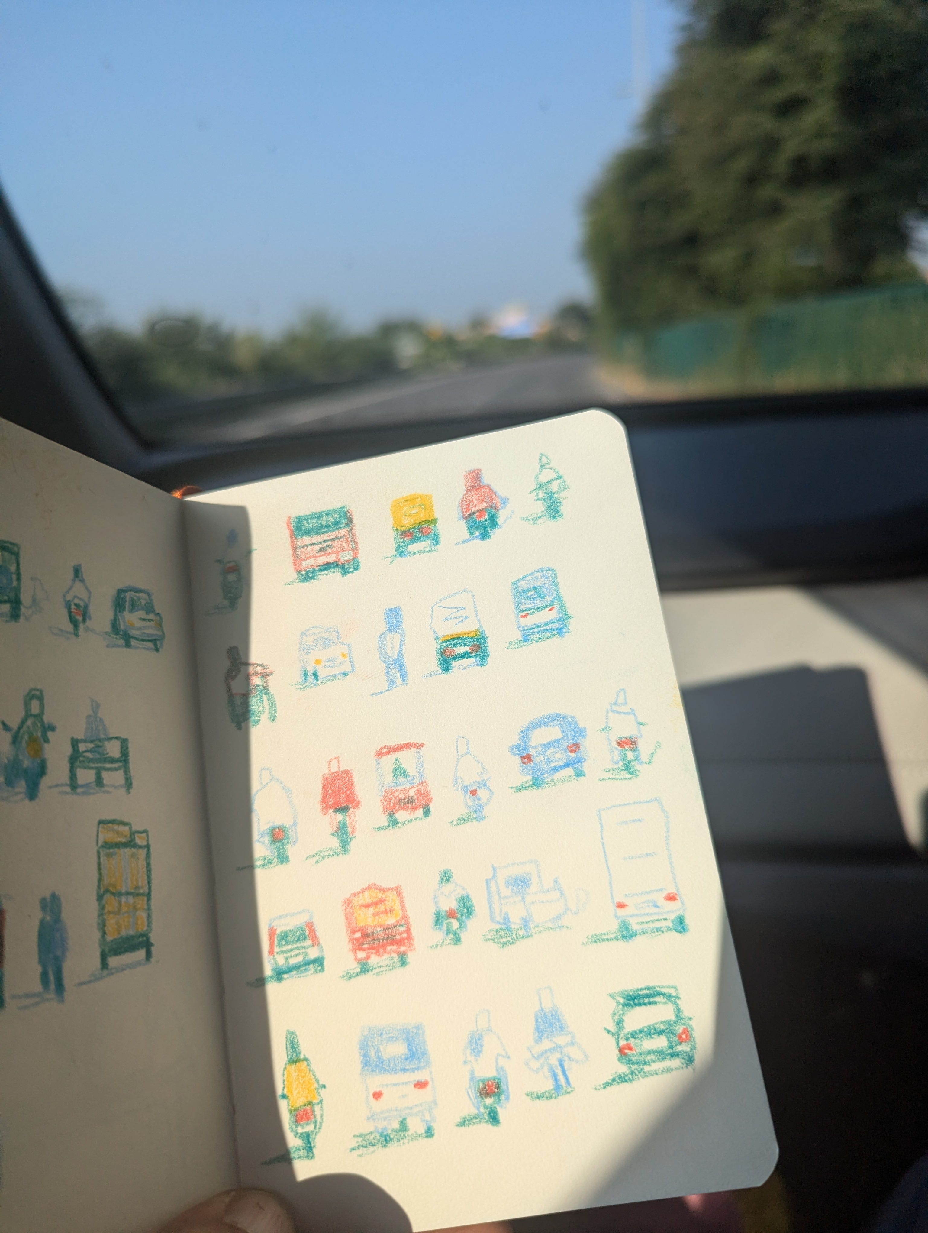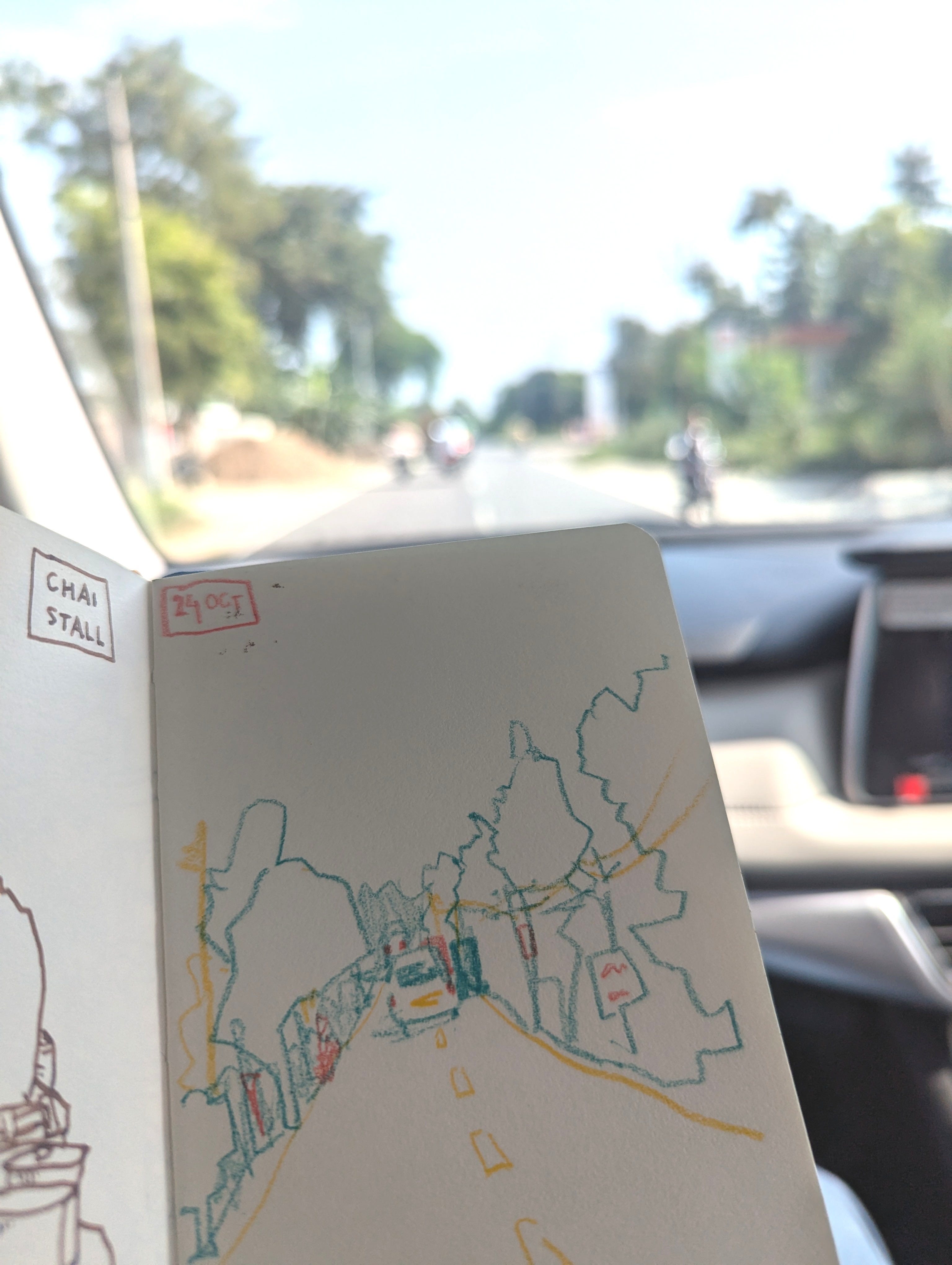 Drawing from the front-seat of a car is an intriguing challenge because … your subject keeps changing itself? At 75kmph, the world whizzes past just as it gains clarity. Within minutes, hundreds of meters are covered. So the page drawn from observation does not correspond to any single spot. You are left with impressions, and you work with memories of impressions, layered upon what is new, and changing, and gone.