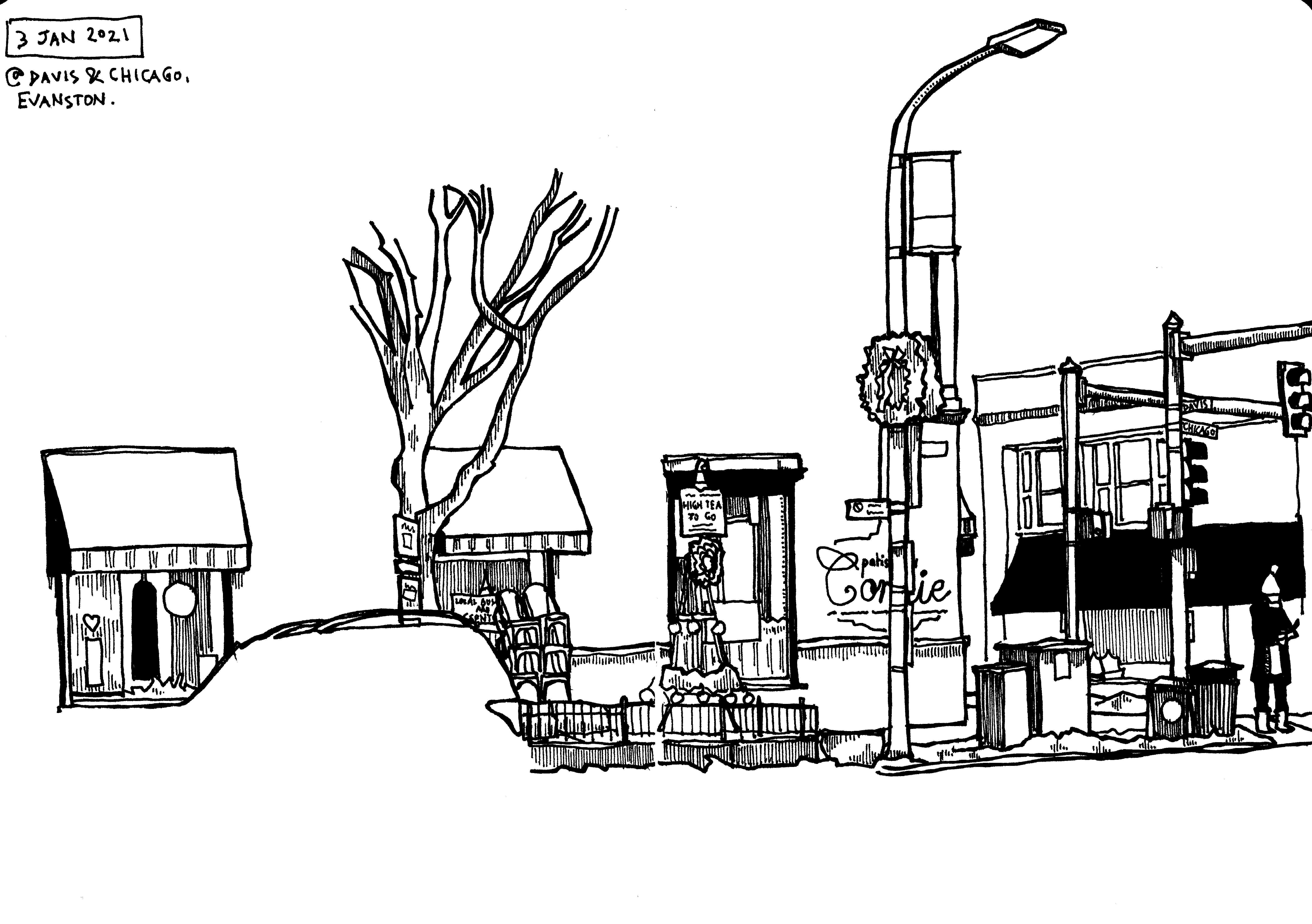 I drove to a different part of the city, looking for something to draw and a fresh coffee and bagel. I found some beauty at this street intersection, and here is what I made of it. It is dedicated to the resilient Chicagoan, a stranger waiting at the traffic light.