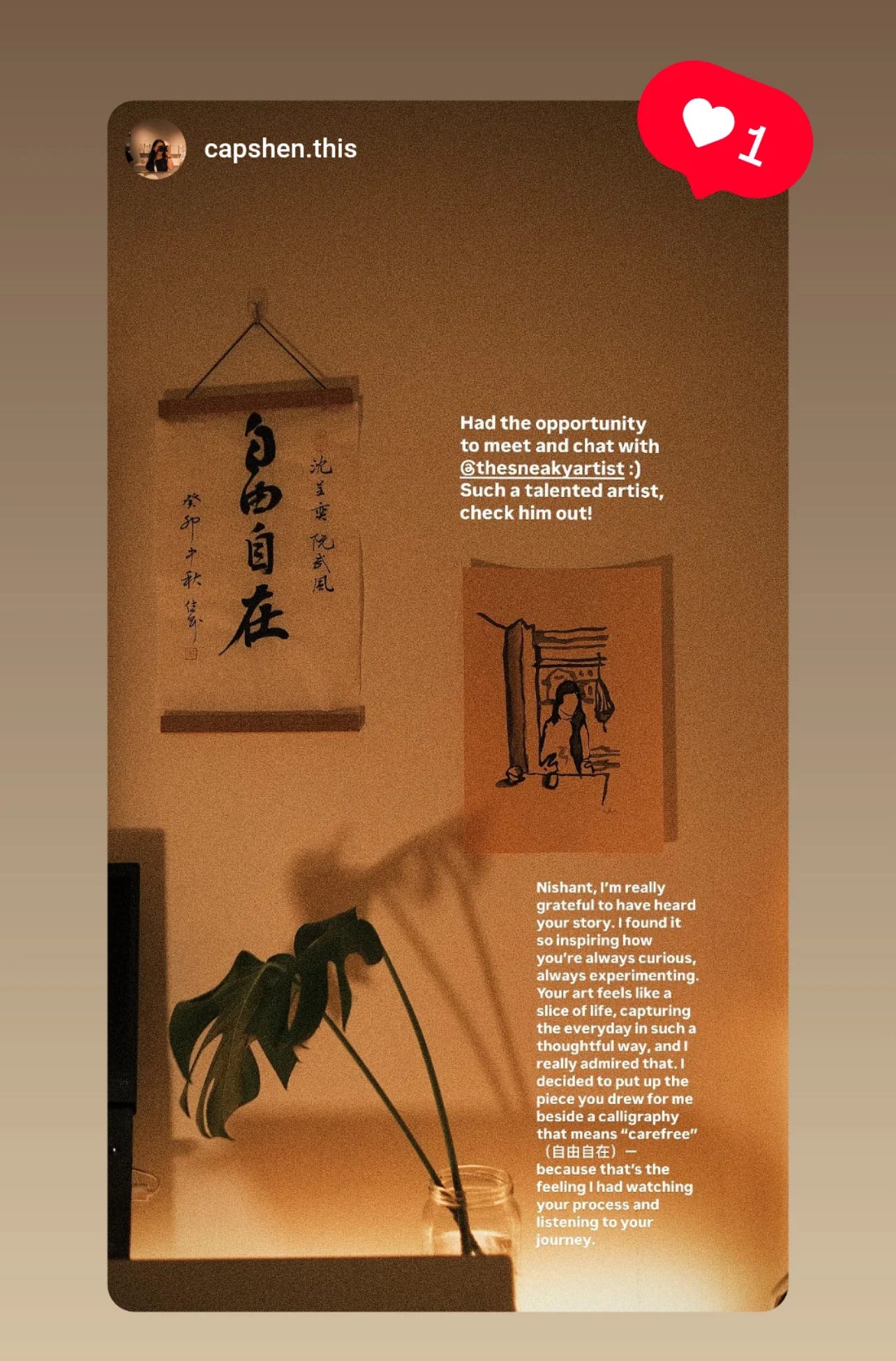 Sneaky Art happens and I capture it as best as I can. The drawing is thus an artifact of my world, a marker of time, place, of being witness. It lives in my world then, on the wall, or a shelf, or in a plastic bag, or in a box labelled “$20”. When someone picks it up, it leaves my world and enters their world. In this world, it will be displayed on a new wall in a new room of a new home. It will be seen by new eyes that have never seen it before, that never saw it as it almost was, as it could have been, as it nearly became. They will see it as it is. What it is is a new story, almost unrelated to me. Thus, the art will lose its original meaning, but gain several new meanings.