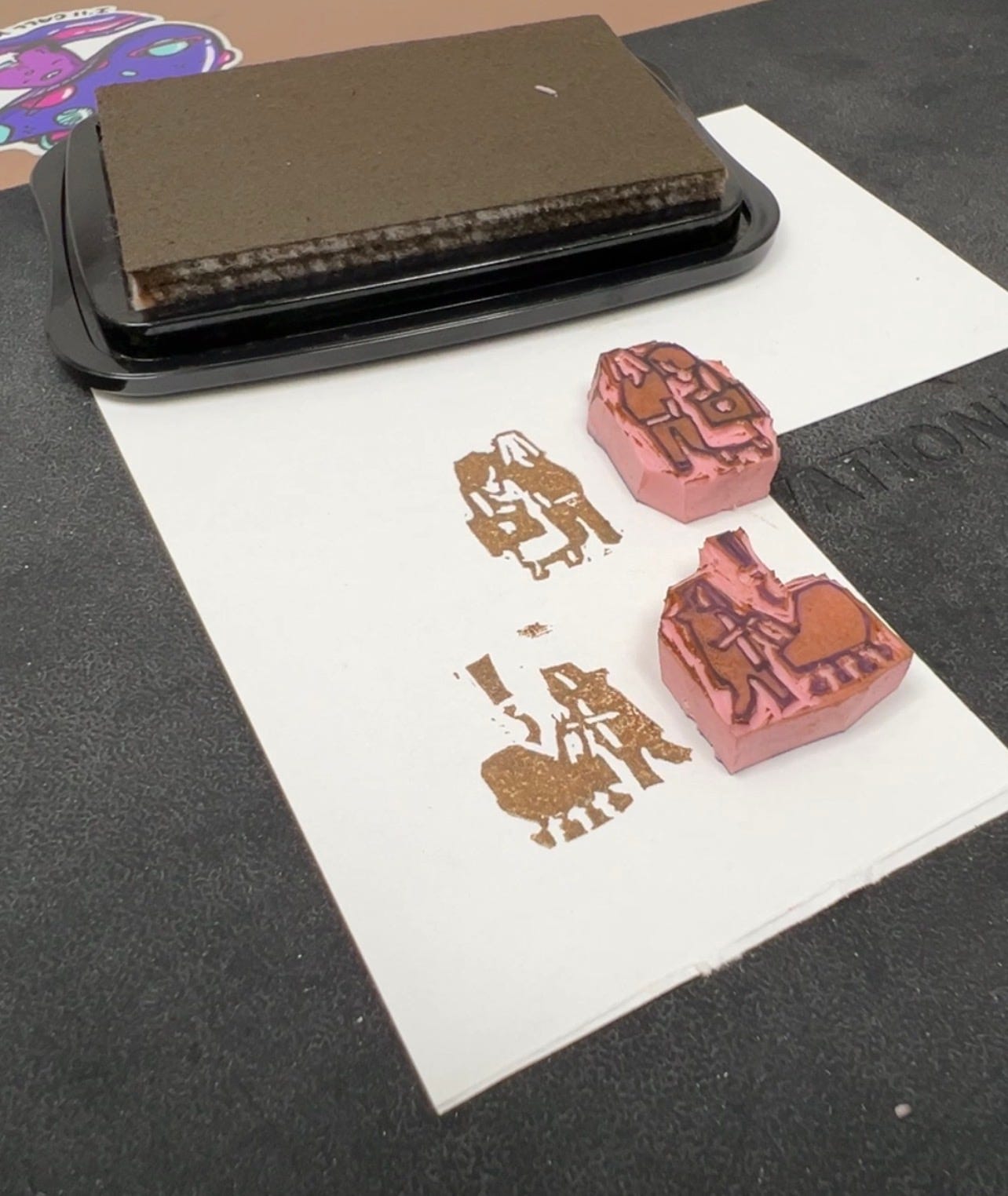 Inking is an art too. You can smudge the page if you are not careful. The inch-long icon can slip between inky fingers. You can over-ink the block and flood the finer cuts. There are many human errors to think about.