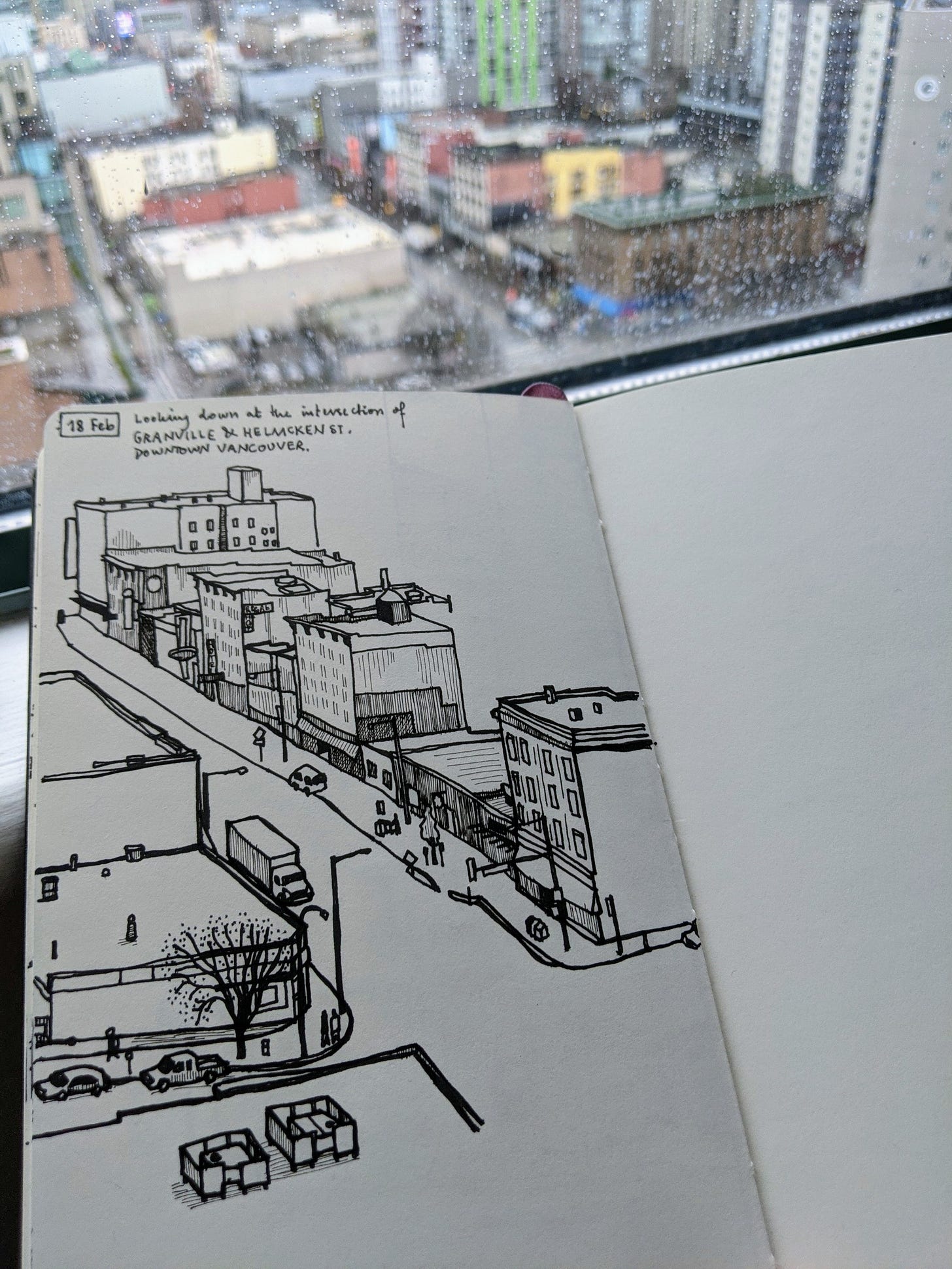 I had a lot of fun drawing it because the scene challenged me in different ways. I had to think for a few minutes about where I wanted to begin. I had to think which direction I wanted to go. I needed to account for two different sets of perspective - the angle of the street to the horizon, plus my high vantage point.