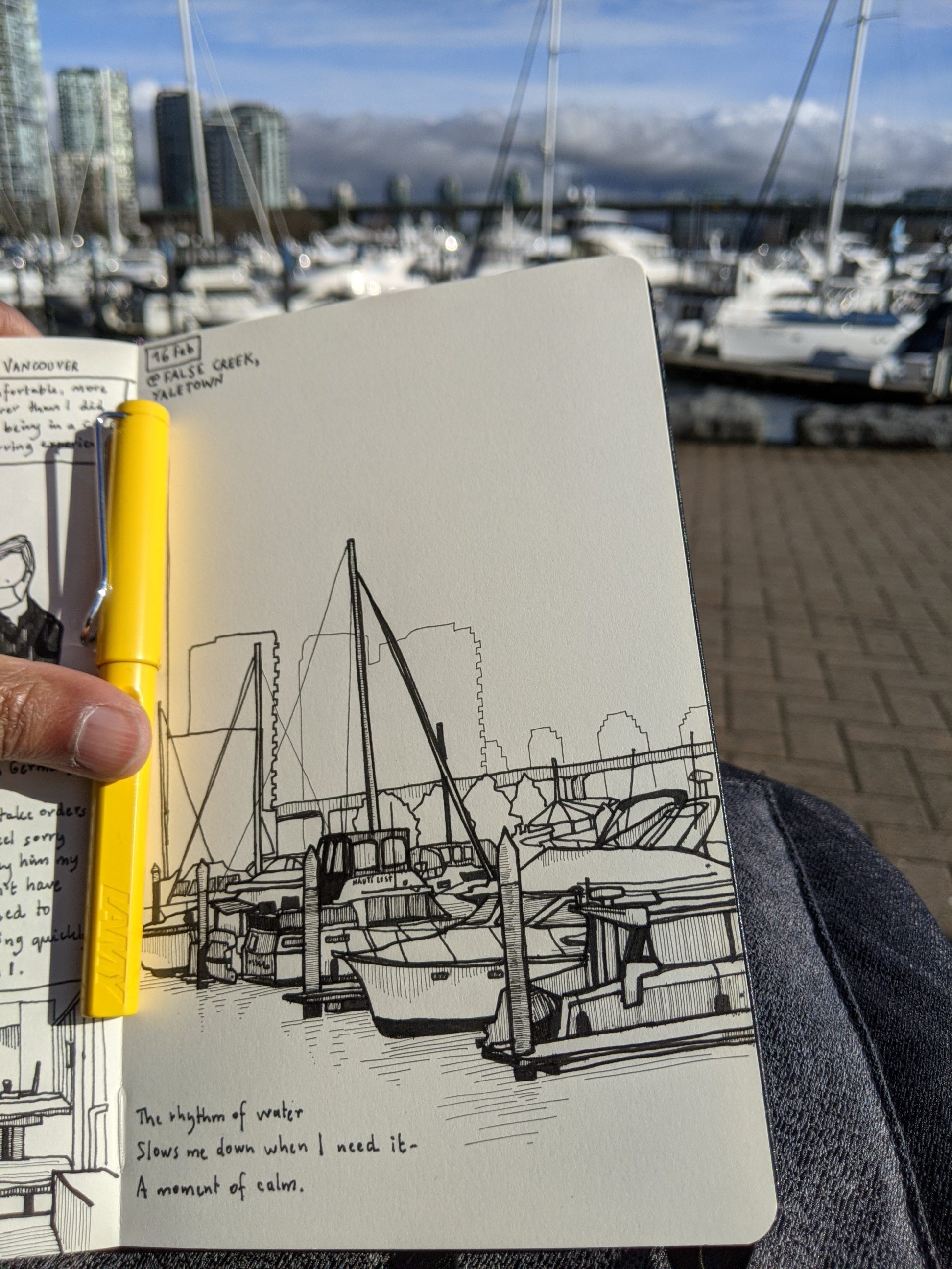 We live not far from the southern waterfront of downtown Vancouver. There is a dock there, and a body of water called the False Creek. I went there this week to catch some sun, because I’ve already learned sunlight is a precious commodity in this part of the world. You grab it when you can get it.