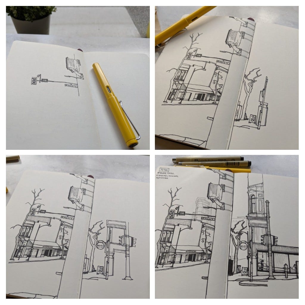 The latest podcast episode is being received very well, and I am glad I put in the effort for it. It is the longest I have worked on a single episode, because I had to design the flow of the entire piece. I scripted it in 3 different ways, not sure which kind of flow would be most appealing. I thought about going chronologically, but the connections I wanted to make were not chronological. I thought about covering each guest an equal amount of time, but striving for that artificial fairness is not the best way to design a listening experience. I decided to make it as a journey through the questions and doubts we face as urban sketchers, or artists of any type - first, the hesitation to put pen to paper, then the self-doubt about doing it well or ever trying again, through the excitement of enjoying it, and past the hurdles to building a sustainable habit and an enjoyable practice. For each of these obstacles I found my guests had already given nice answers, at times self-referential and at times drawing from their experiences teaching others.