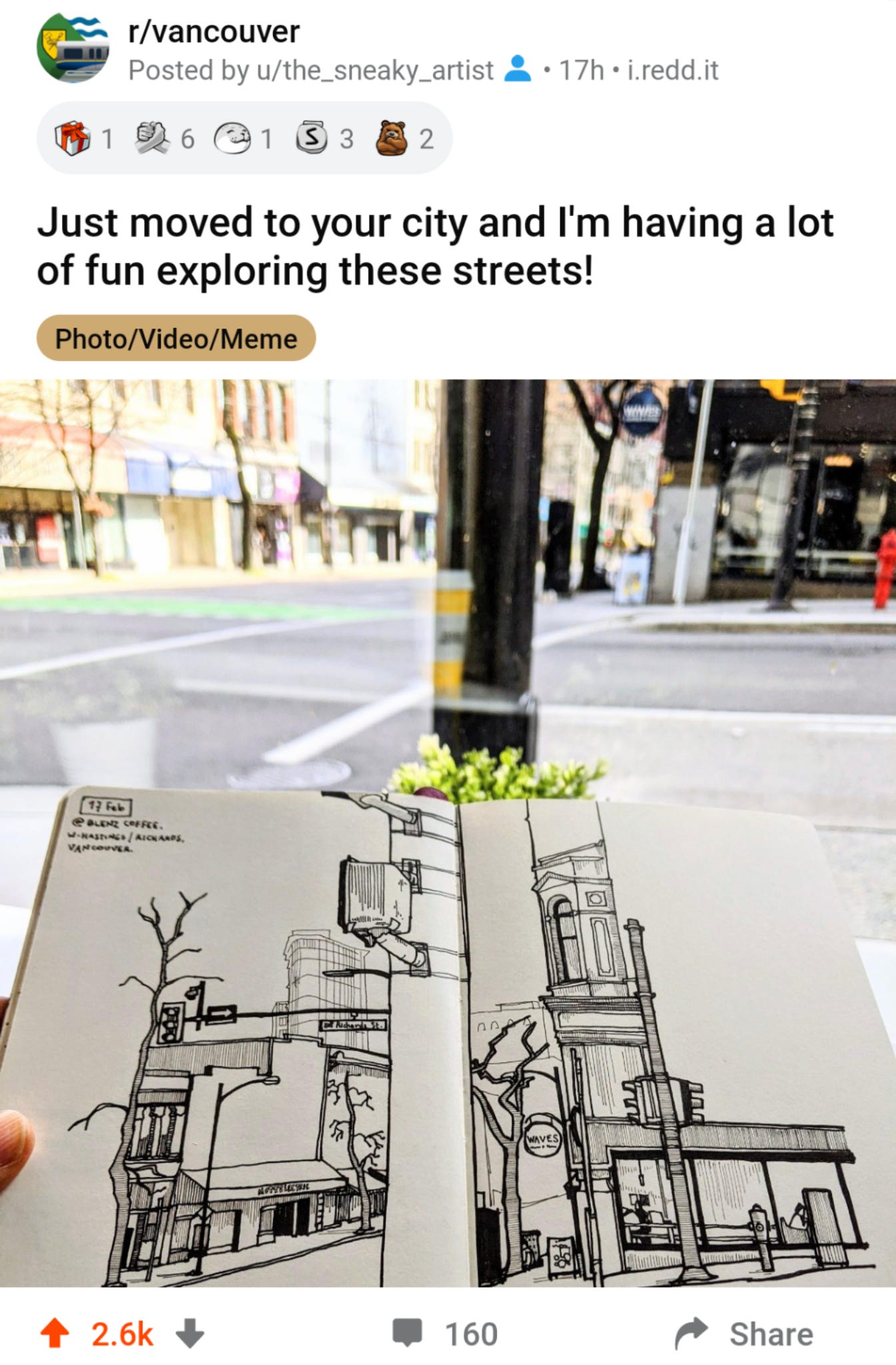 I shared this drawing on the subreddit r/vancouver and it caught a lot of good attention. It led to an influx of new followers on Instagram, a couple of commission requests, and new readers on this newsletter. (Hi, guys!) I love posting on Reddit. You find genuine appreciation, and any follows you gain from it are 100% organic, real growth. Zero artificial coloring.