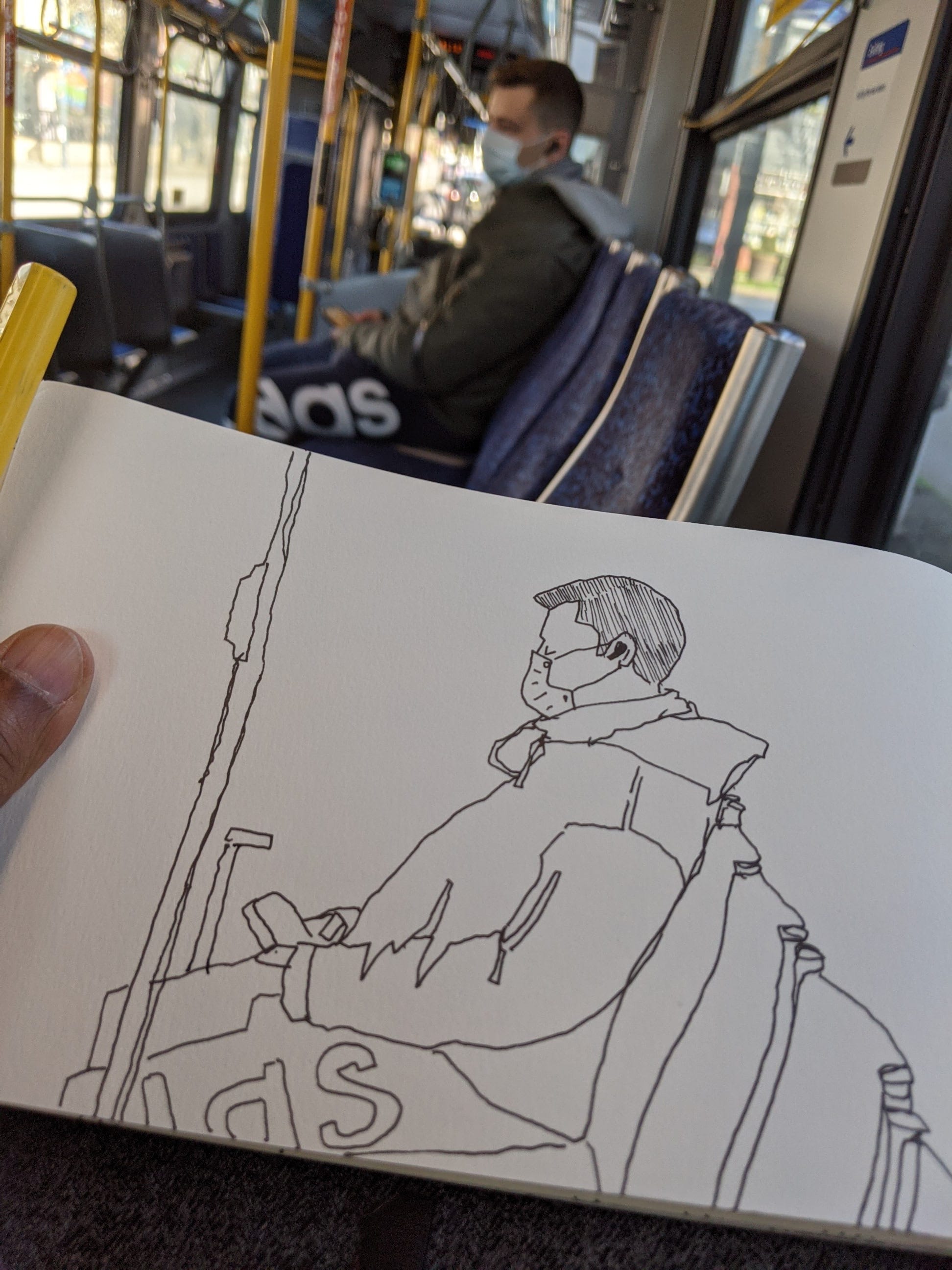 On the bus ride back home, I made a quick drawing of a fellow passenger lost in the reflections of his phone. Completed it just as he got off.