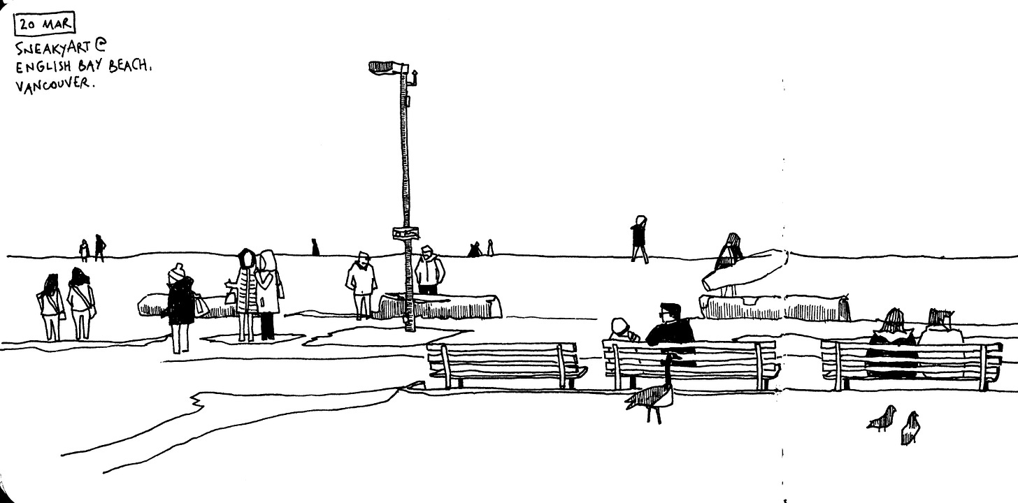 We went to check out the University of British Columbia campus and it is very beautiful. At the end of a long day of walking, we sat down with coffee to enjoy the view, and I made this drawing. So much of composition is affected by the ‘sketchbook frame’, both what we emphasize and what we discard. The frame decides everything.