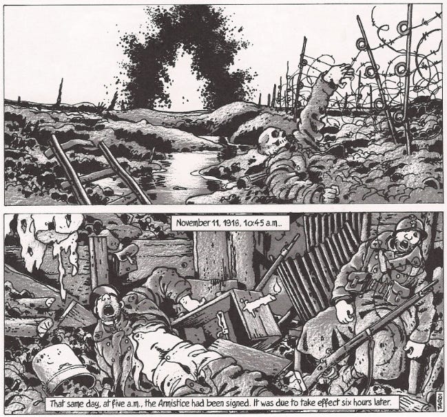 I share also the work of a graphic novelist who first tuned me into the ravages of war. The book was “It Was the War of the Trenches” by Jacques Tardi, and it tells the stories of ordinary people who signed up for the war to end all wars (WW1).