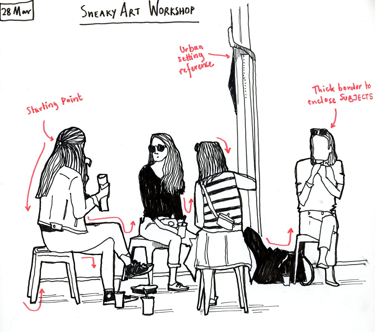 Below are some demos I did during the last workshop. The first is the opening demo from the first session, talking about how I observe a busy urban scene and focus on the things that matter (to me). As I drew, I explained my strategy to move across the page. This is especially important when you work with ink and at speed, because there’s no way to rectify errors or go backwards.