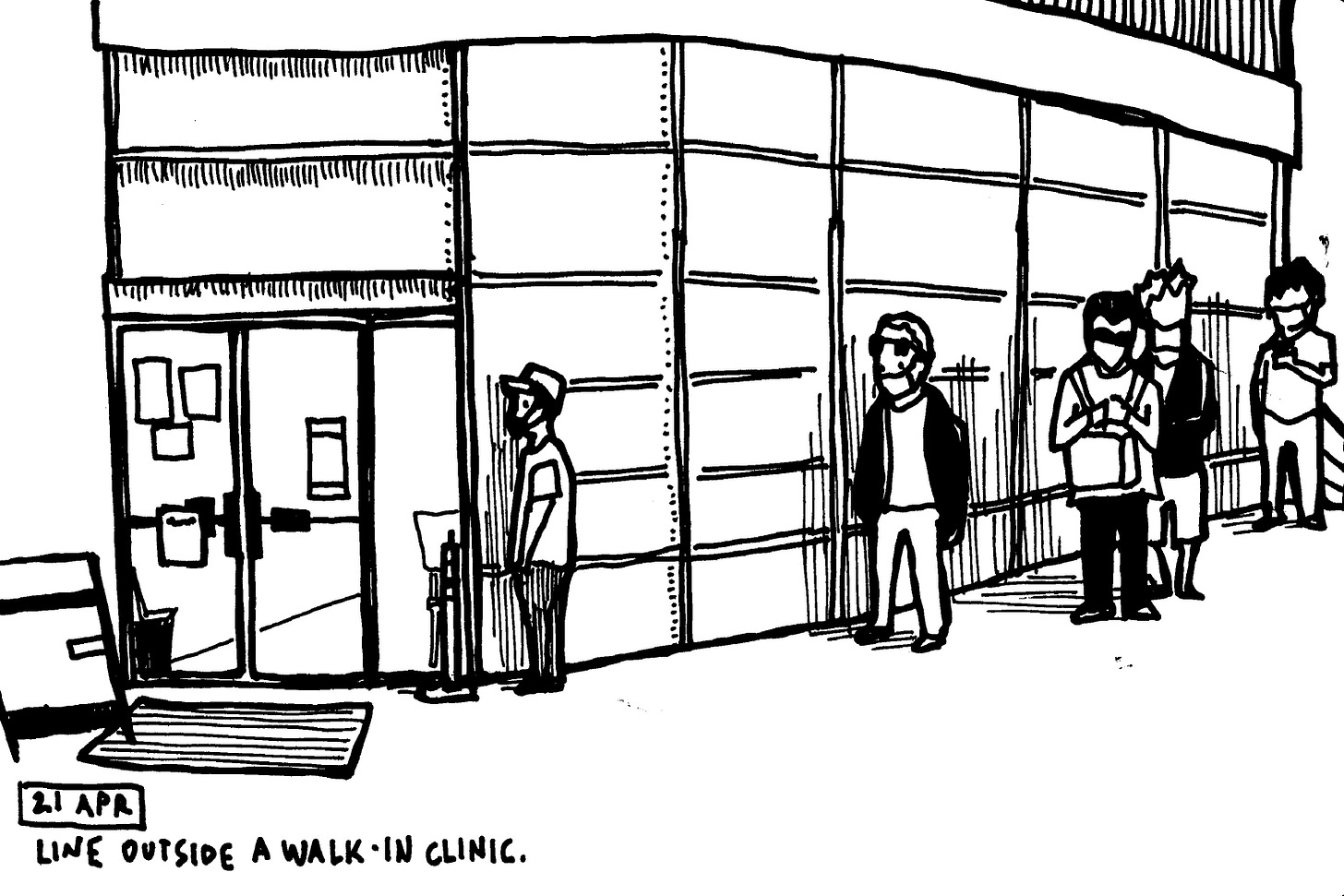 Outside a walk-in clinic in downtown Vancouver. The wife sprained her neck (occupational hazard of dentistry) and decided to have it checked out. I had to wait outside because, you know, pandemic.