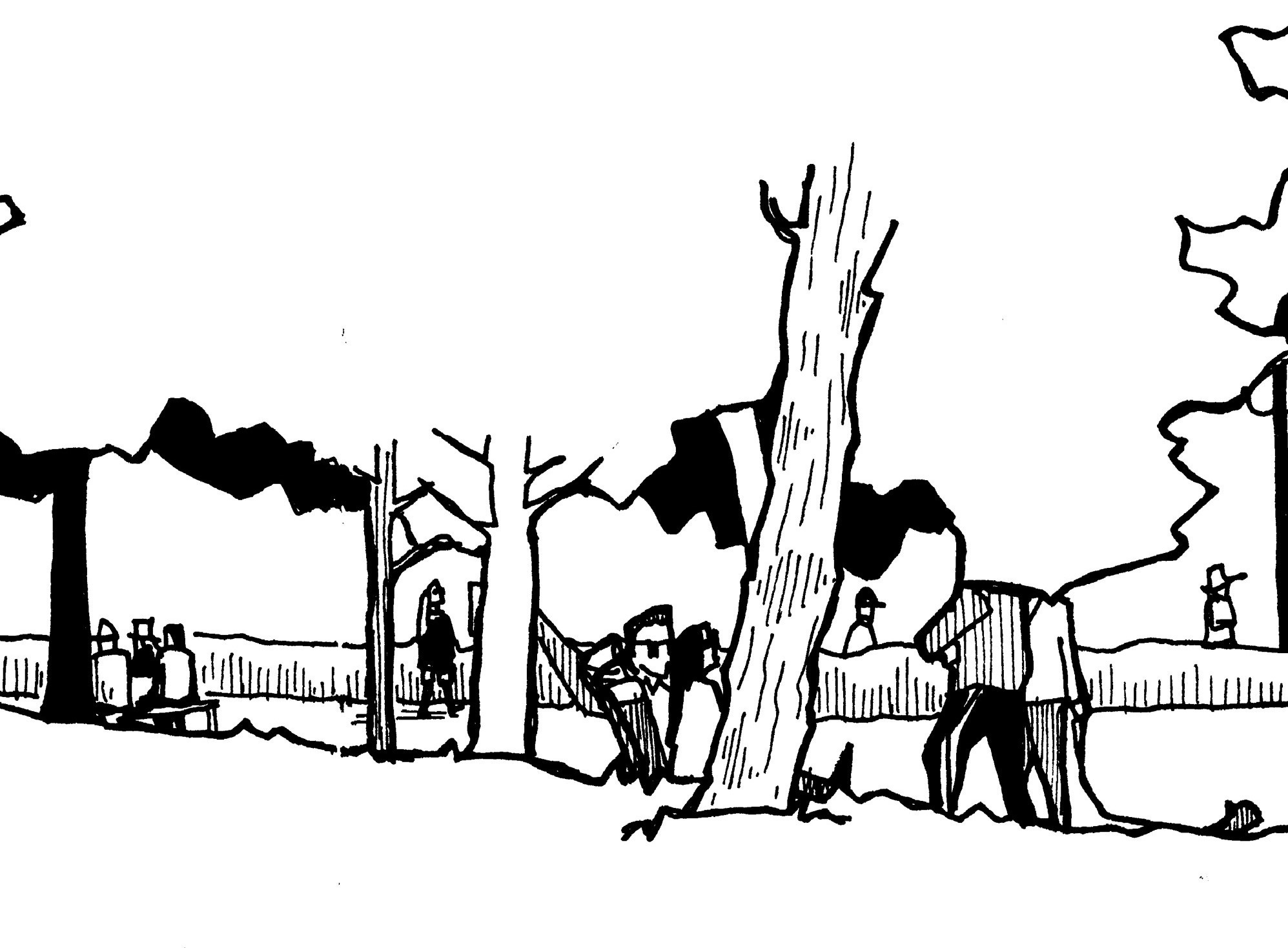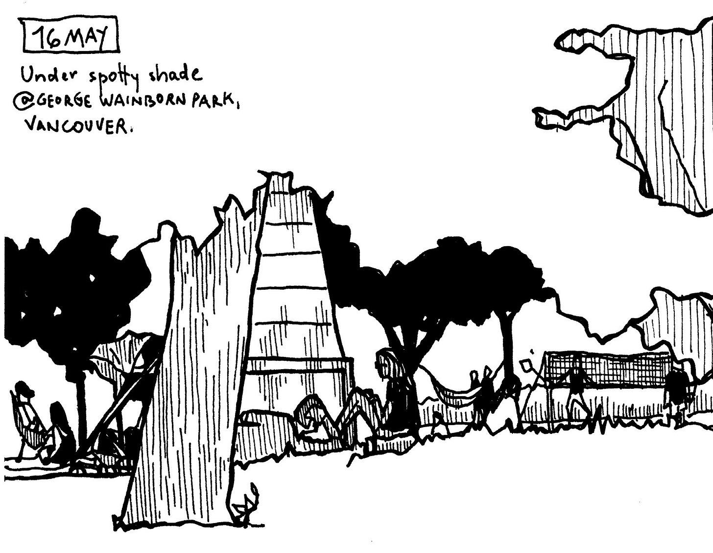 I saw young families, older couples, a person reading a book, people playing badminton, and several people walking along the park’s periphery. In a 1-inch tall space in my sketchbook, over a double-spread, I was able to capture this much life.