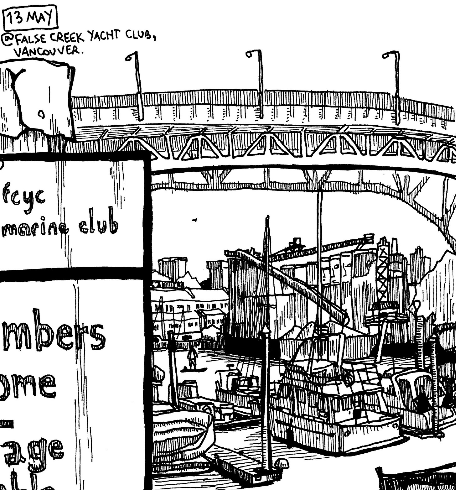 Yachts waddled on water glittering under the summer sun, framed inside bridges and railing and tall masts and a sign saying “New Members Welcome”…