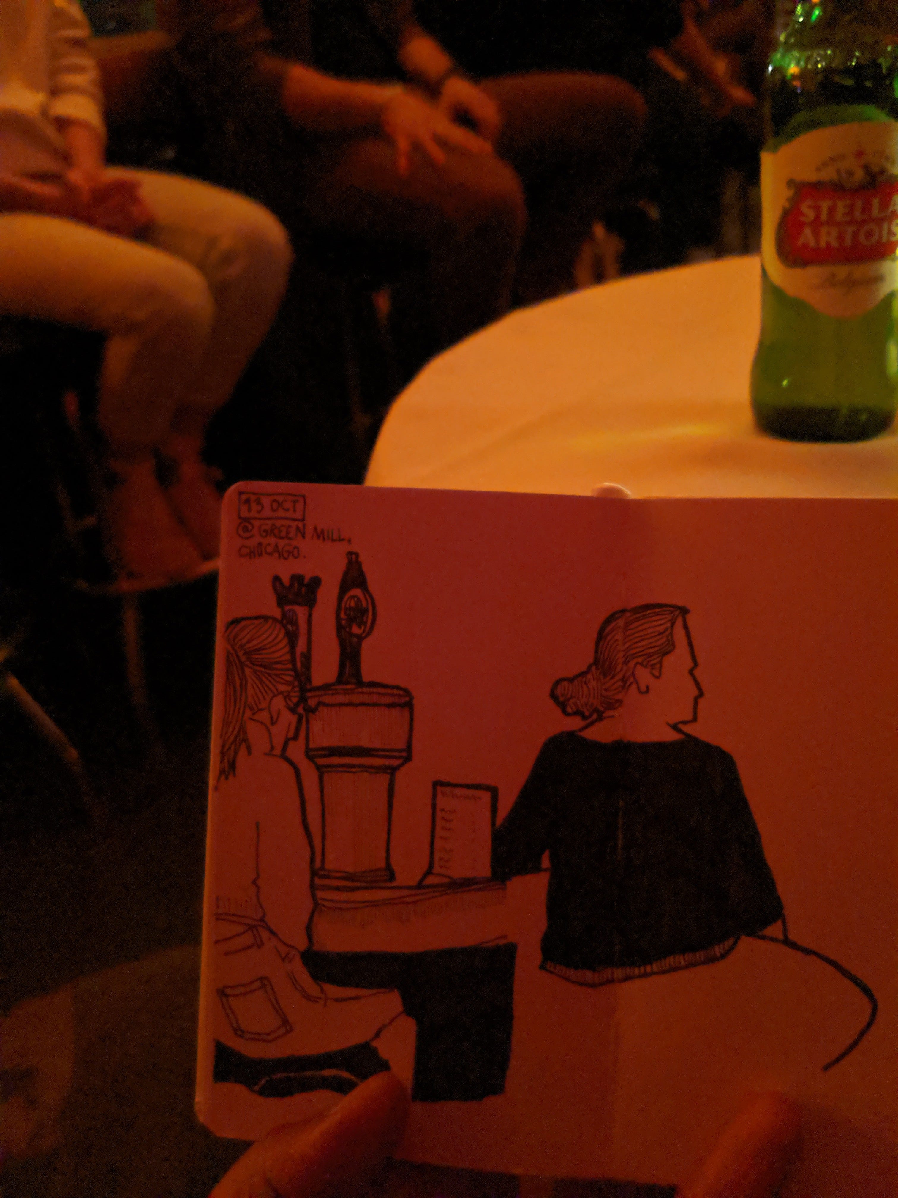 I make my art in public spaces, observing human activity and interaction. I don’t tell the subjects that I have drawn, and they never find out. Everything is very hush hush.