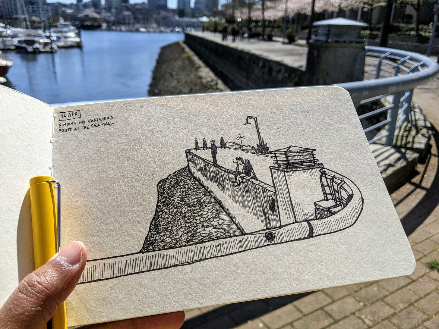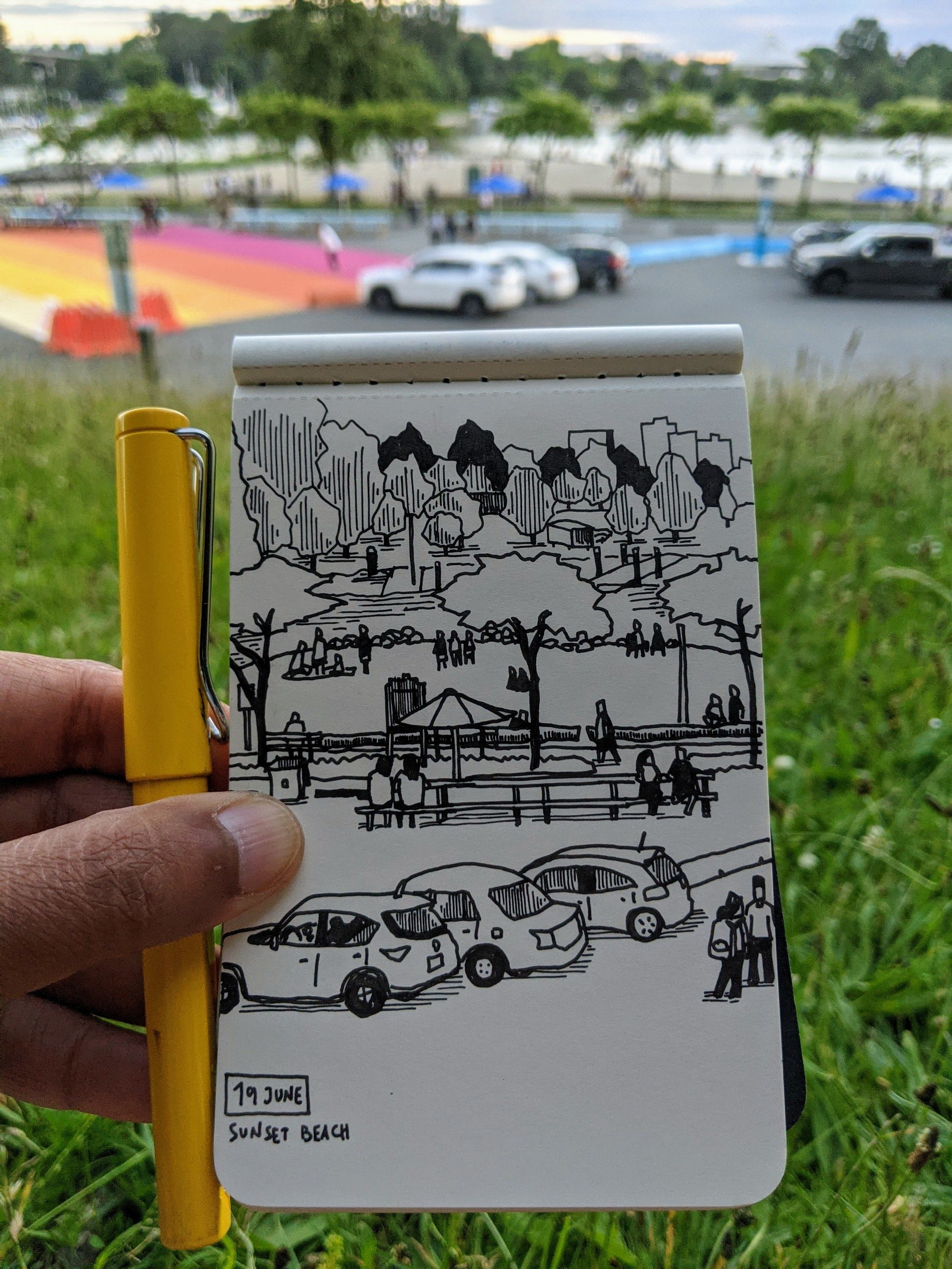 … I drew multiple times from the same spot on Sunset Beach in downtown Vancouver. It is a short walk from the apartment, and a nice place to be in the evening. As case numbers fall and vaccination counts rise, a sense of normalcy is returning to Vancouver life. I am also easing myself into the idea of crowds in public places.