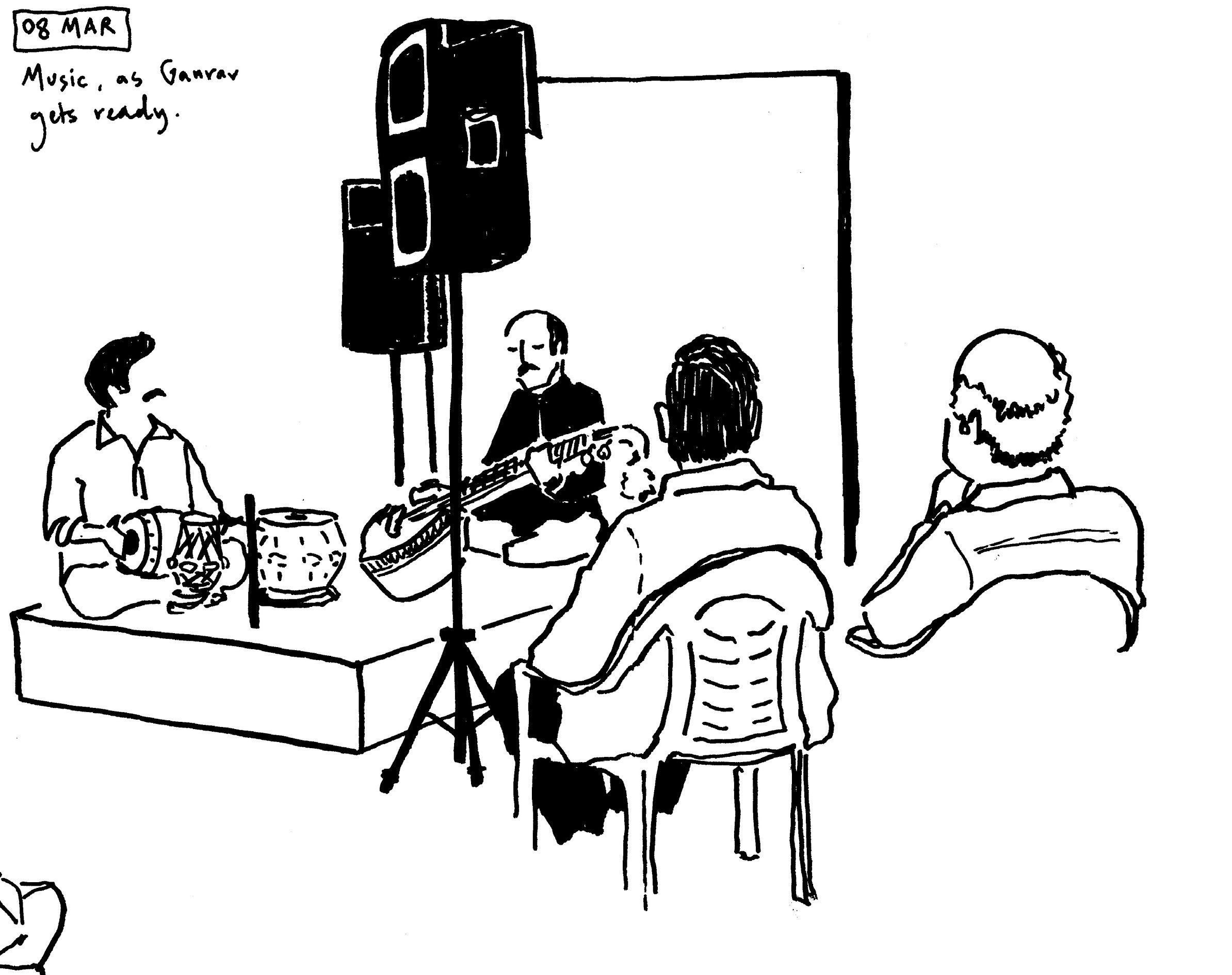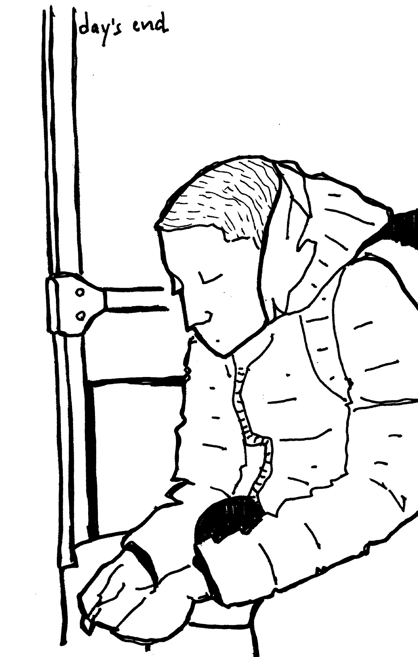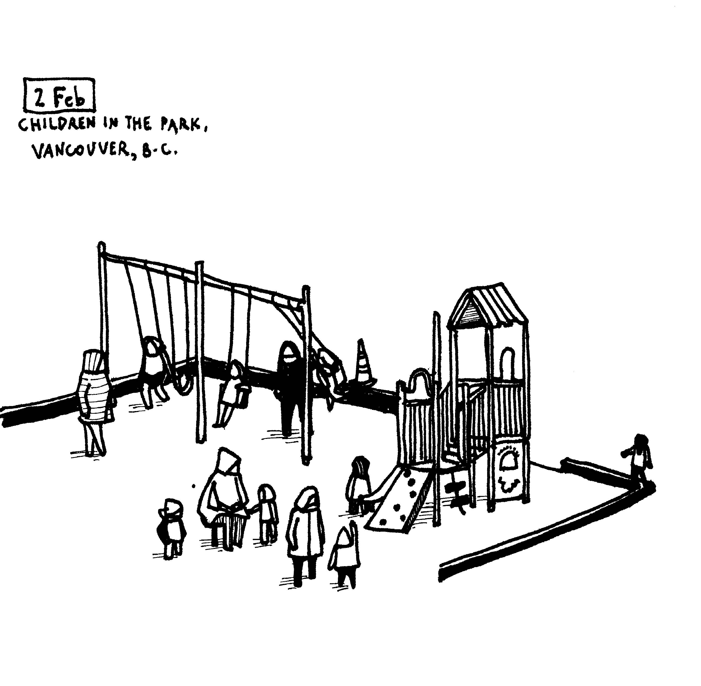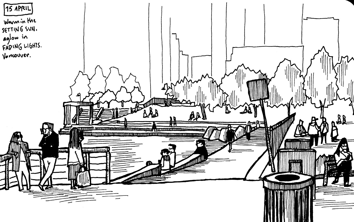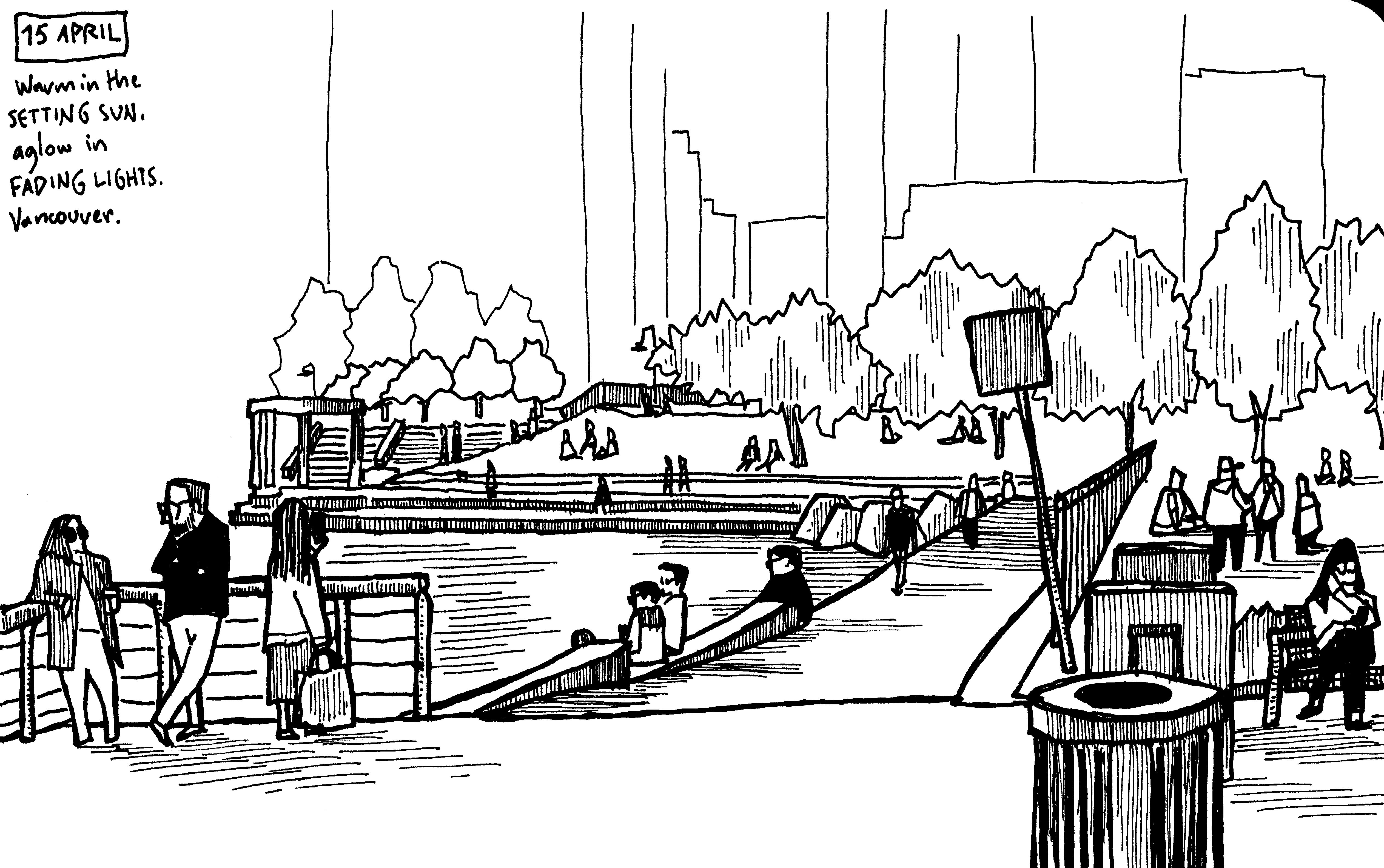 In my art, I use this looking time to discard what is unnecessary. But what is necessary and what is unnecessary? Here, the art becomes subject to the experiences of the artist. In my work, colours are already unnecessary. Sometimes, facial features are also unnecessary. Blades of grass, grains of sand, clouds, buildings, windows, roads, cars, all of these can be unnecessary. In taking away these features from my page, I strive to focus on what strikes me as necessary. In this way, with every drawing, I am not only looking at my scene, but I am also uncovering more about myself. What do I find unnecessary, I could ask. The process of drawing, faithful to my instincts, helps answer the question.