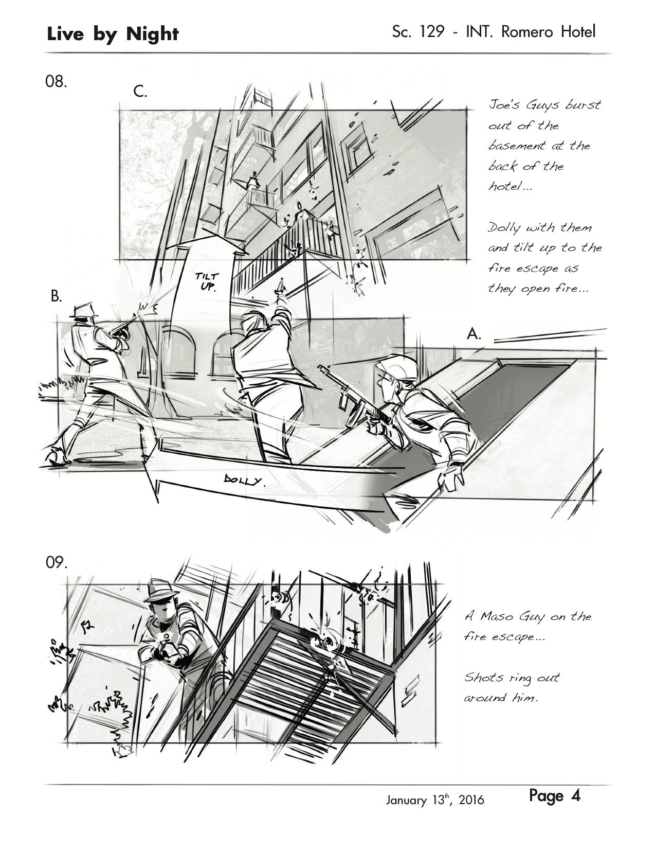 A good storyboard saves a lot of people a lot of time and effort, which directly translates to saving a lot of money! Alex has worked on many films, including Almost Famous, Argo, and Vanilla Sky. Below, I include a page of his work for the film “Live By Night”.