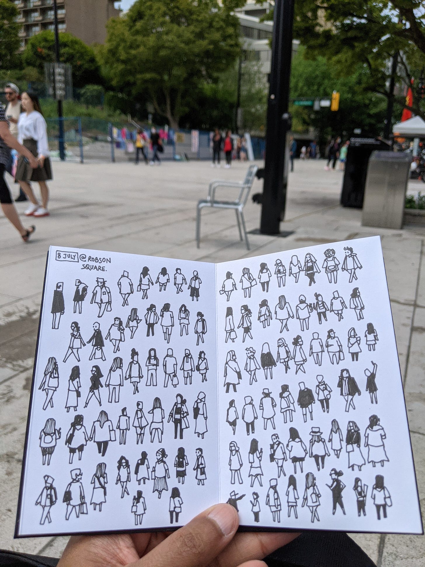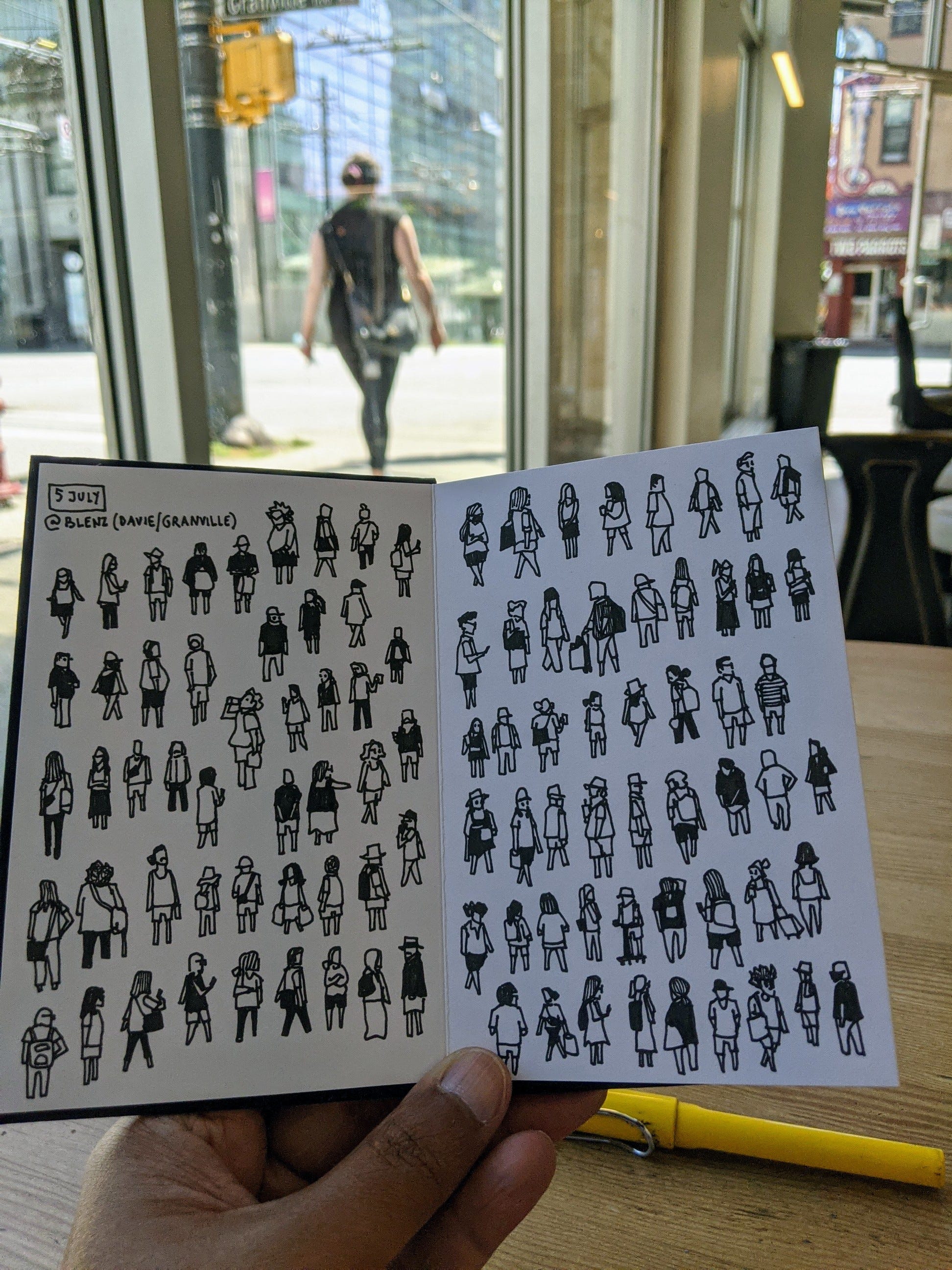 I love to draw tiny people. It is a game I play versus reality, and it is a game of speed and dexterity and instinct. Here is how it goes.