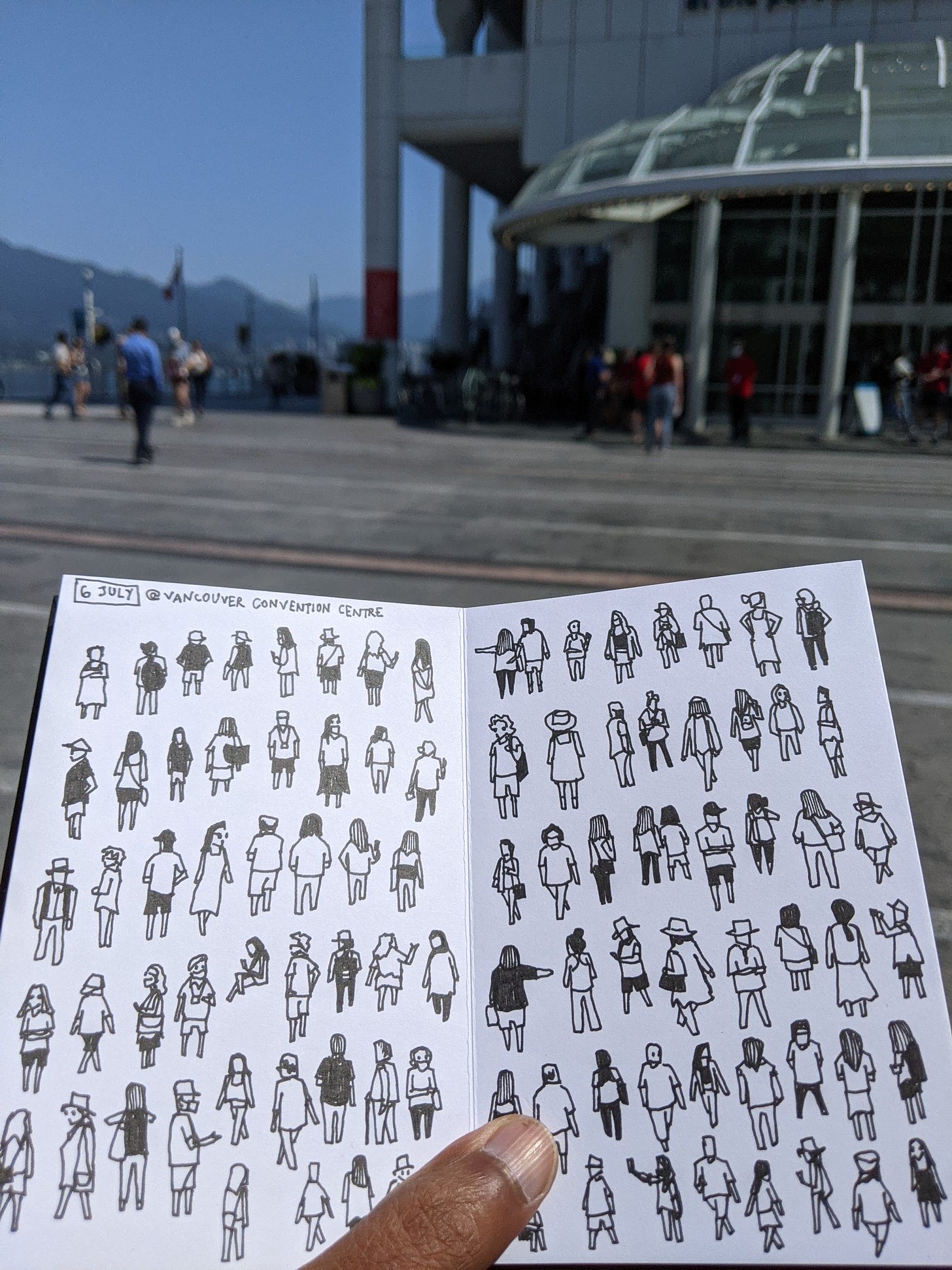 I draw each of these two-page spreads in about an hour. For the one below, someone on my Instagram counted to tell me that it’s exactly 100 people. So I drew 100 people in 60 minutes, which comes to 1.6 people per minute!