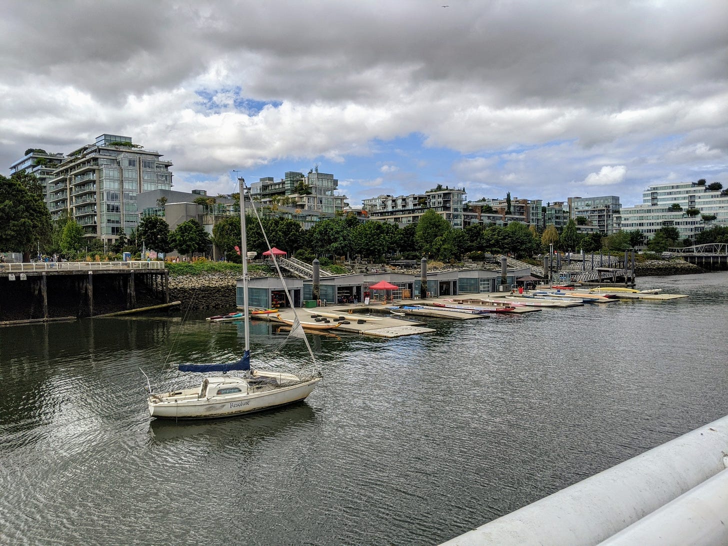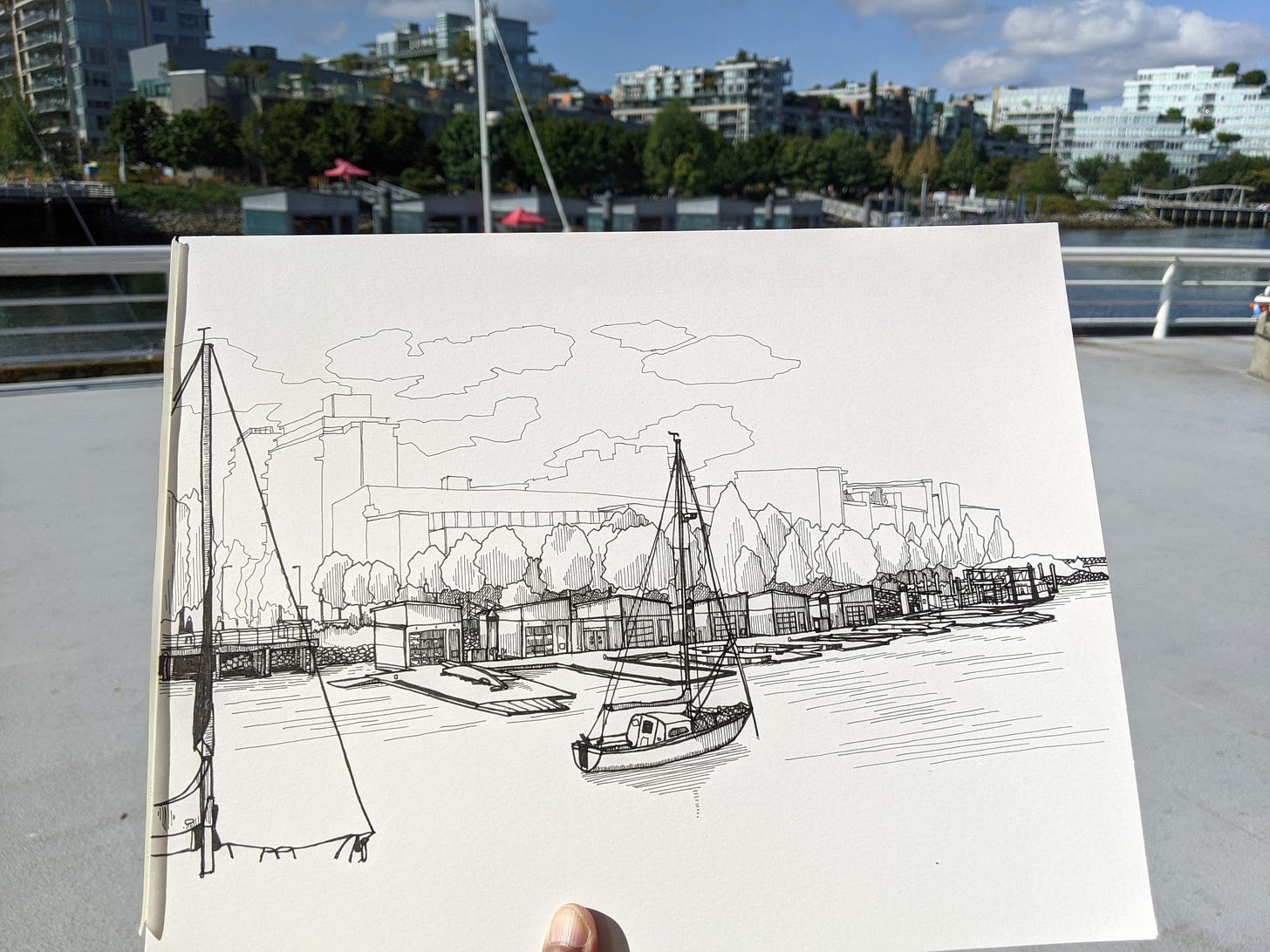 Drawing boats that are anchored in the water is an interesting challenge. While the water was relatively calm, the boats were too. But as rowers and water-taxis began to ply on False Creek, the prominent boat featured in my drawing began to revolve around its anchor, returning to its original position in a cycle of perhaps 3-4 minutes. So I had to draw it the way I draw people - big shapes quickly, and inner details to the best of my observation.