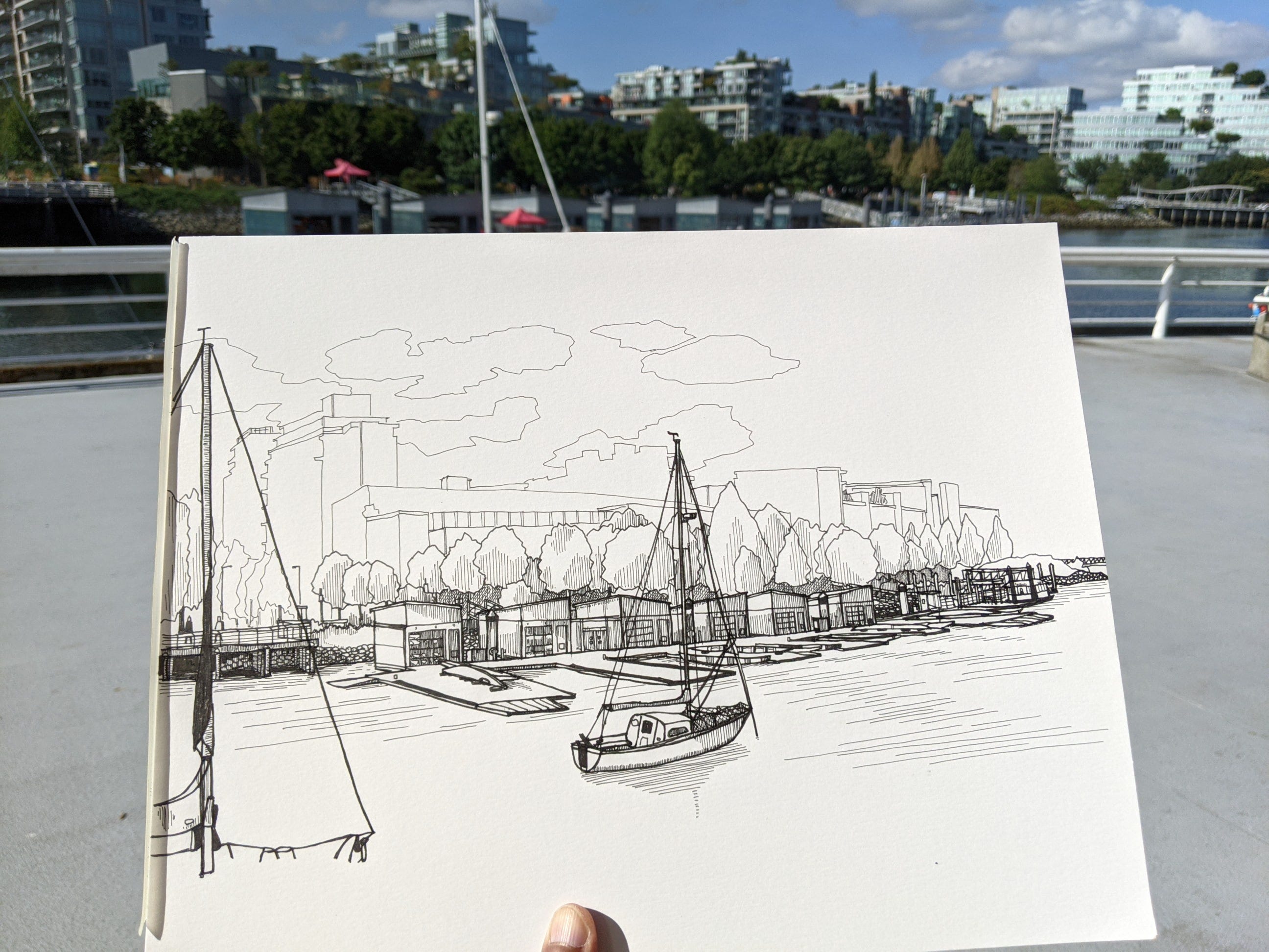 I have been commissioned by a marina construction company to make art of their most popular docks and marine works. I shared one last week that I drew in Victoria, on Vancouver Island. This week, I drew the Dragon Boats Dock at False Creek.