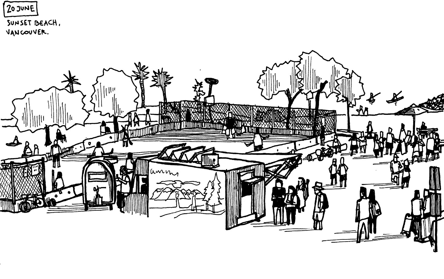 The second reason I like to include human activity is precisely the reason Ian does not. When I draw an urban scene - like the one below at Sunset Beach - I am weaving together the human activity I see over the course of time I spent there. These people did not occupy those positions at any single moment. For example, when I drew the person waiting to pick up their food order, the couple dancing behind them may have already left.