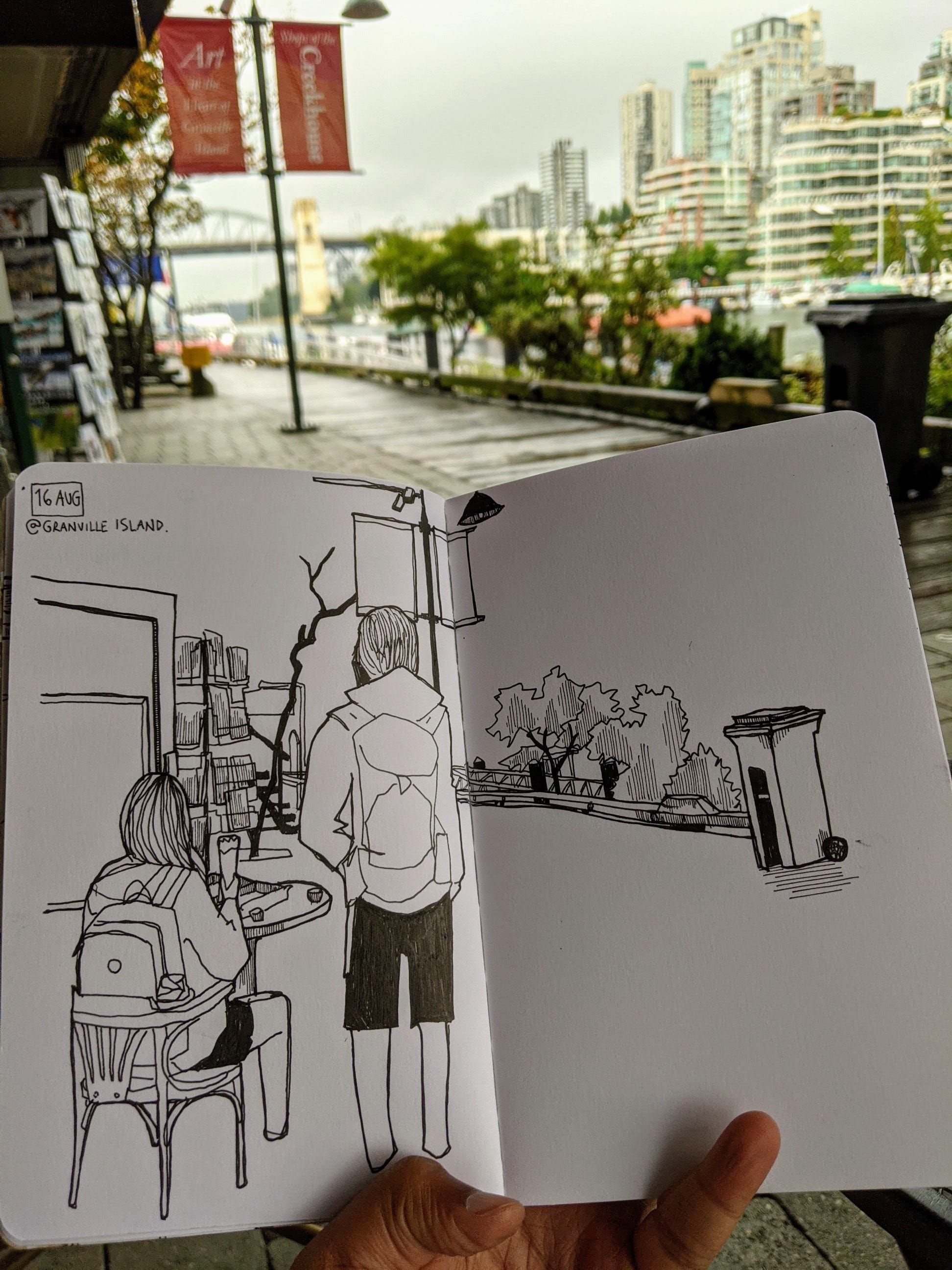 I spoke with them at Granville Island on a rainy afternoon. After the interview, I walked about looking for a coffee and an empty seat. Dry places to sit are a premium once it begins to rain. But I found a spot under the canopy of a cafe just off the main dock, away from the touristing throng. From time to time, the wind sneaked raindrops in under the canopy and onto my page, and I would wipe them away.