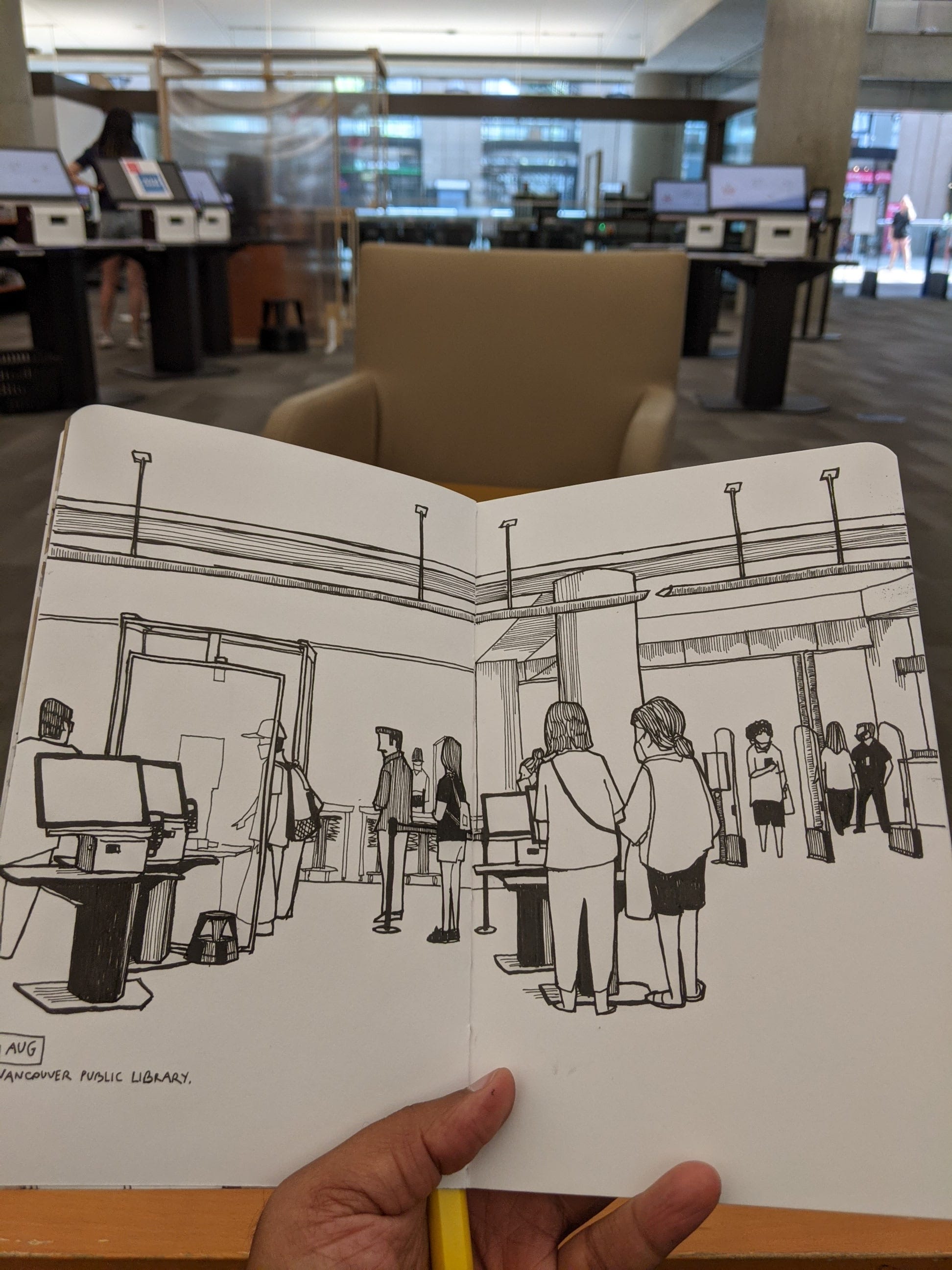 Reading in a library feels right. It is quiet, comfortable, and private. Anyone else you see is engaged similarly. But after some reading, and making notes for the podcast, I needed to stretch my mental muscles as well as my legs. So I took out my sketchbook and went up and down the floors, in search of a place with a view. I found it at the entrance foyer, on a comfortable sofa in front of the self-checkout machines.