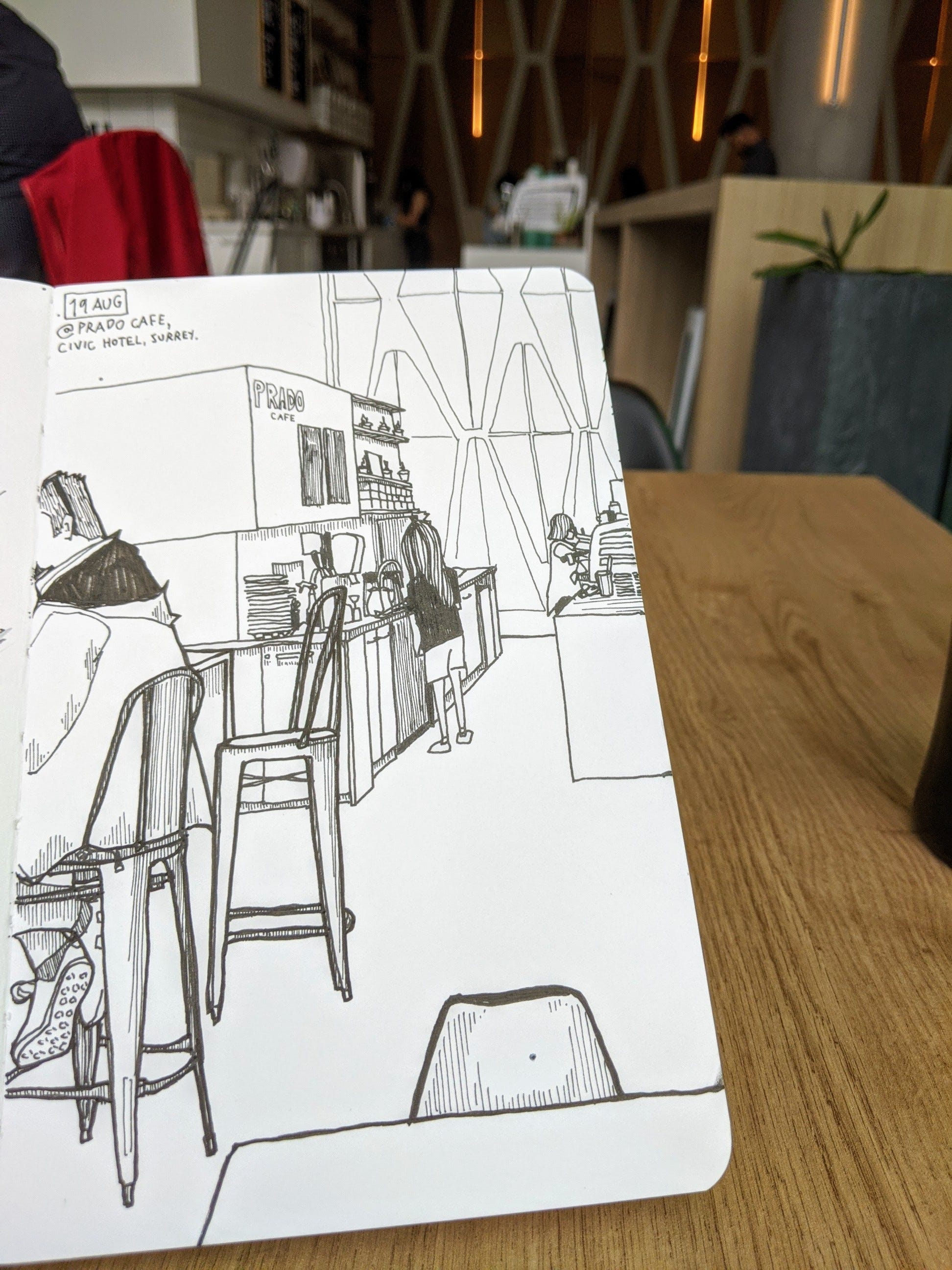 Speaking of commissions, I went to Surrey City Hall to deliver the drawing I made at Surrey Plaza. Before leaving, I grabbed a coffee and an opportunity for SneakyArt at the nearby Prado Cafe.