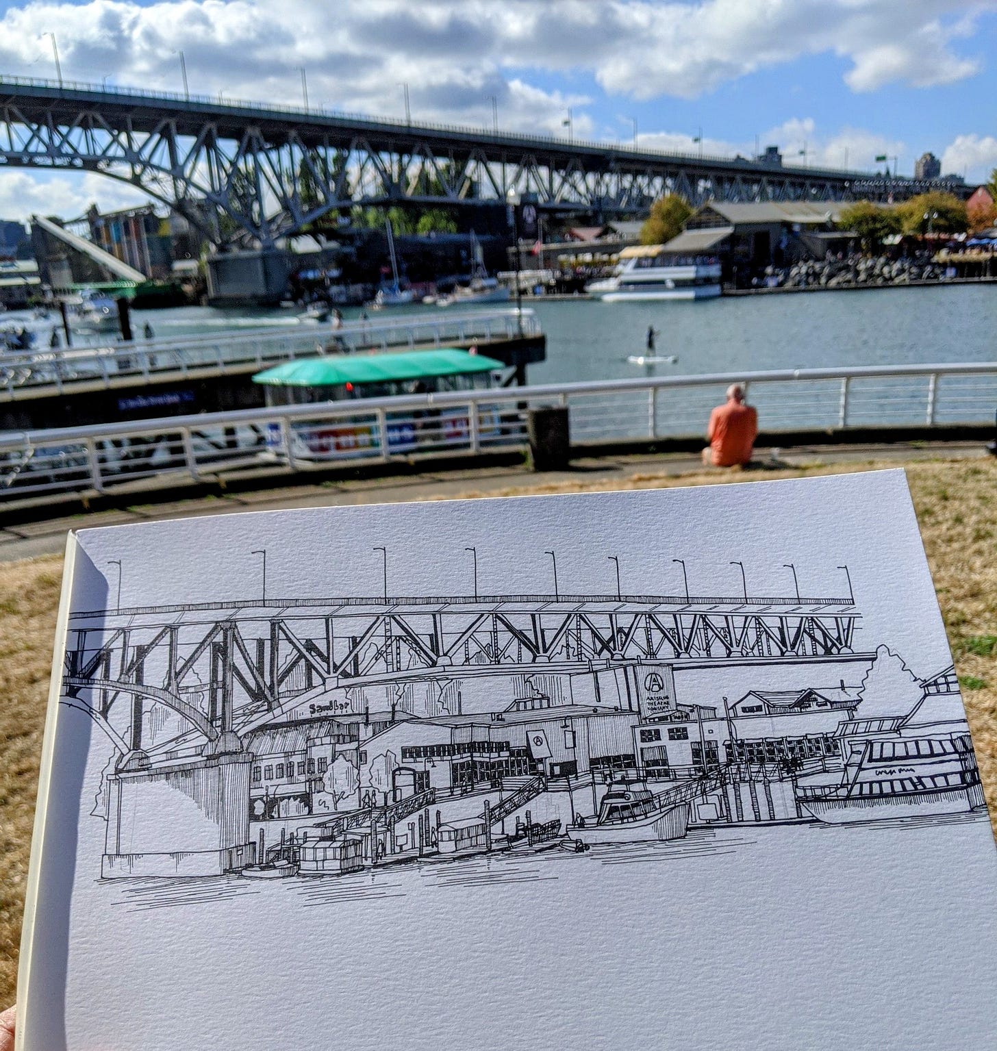 I found a spot to sit across the creek early in the morning. As I began, the sun climbed over the skyscrapers behind me and the first rays glittered against the side of the boats. By the time I was finished, it was mid-morning and the rest of the world had come to life as well.