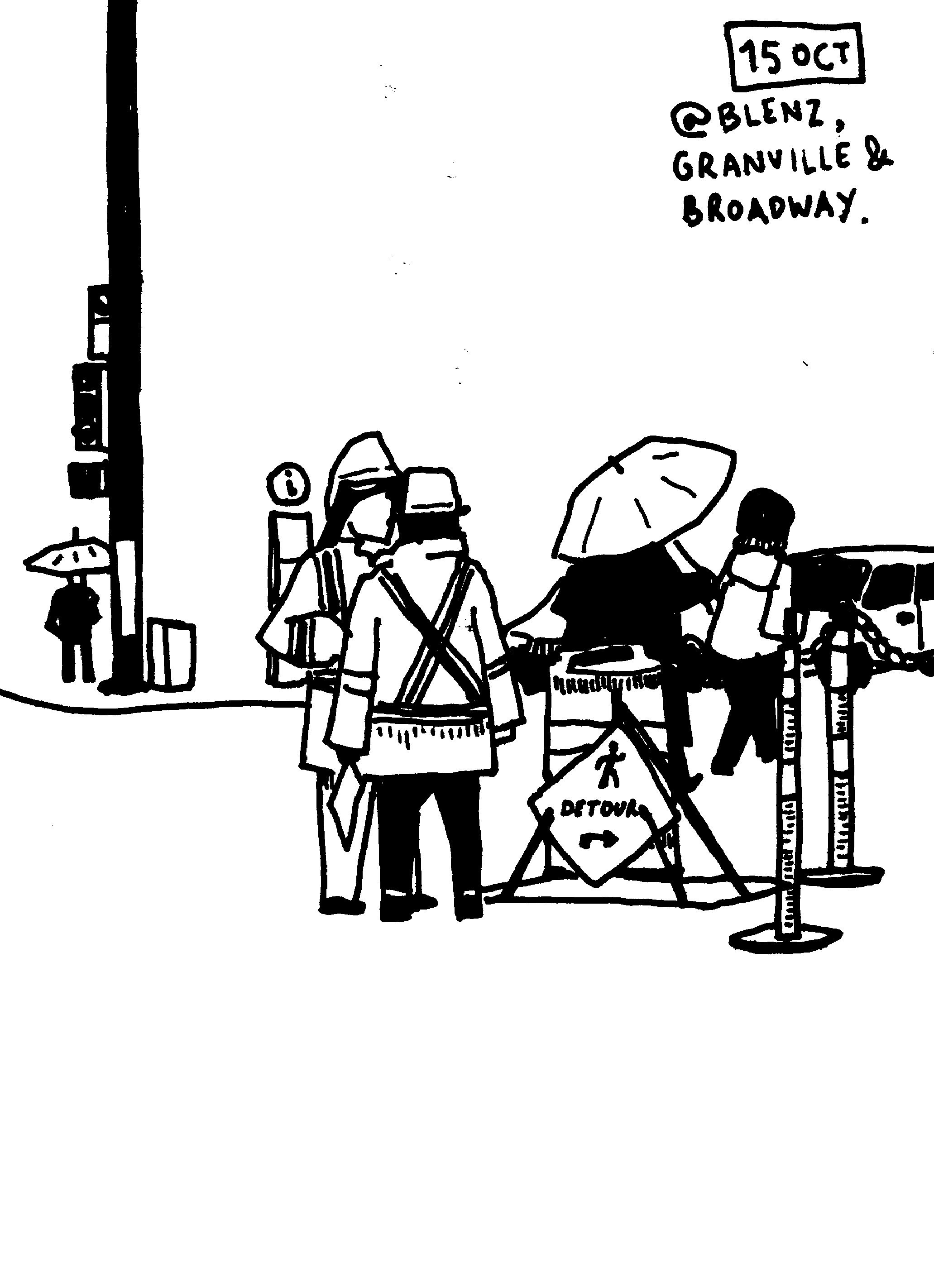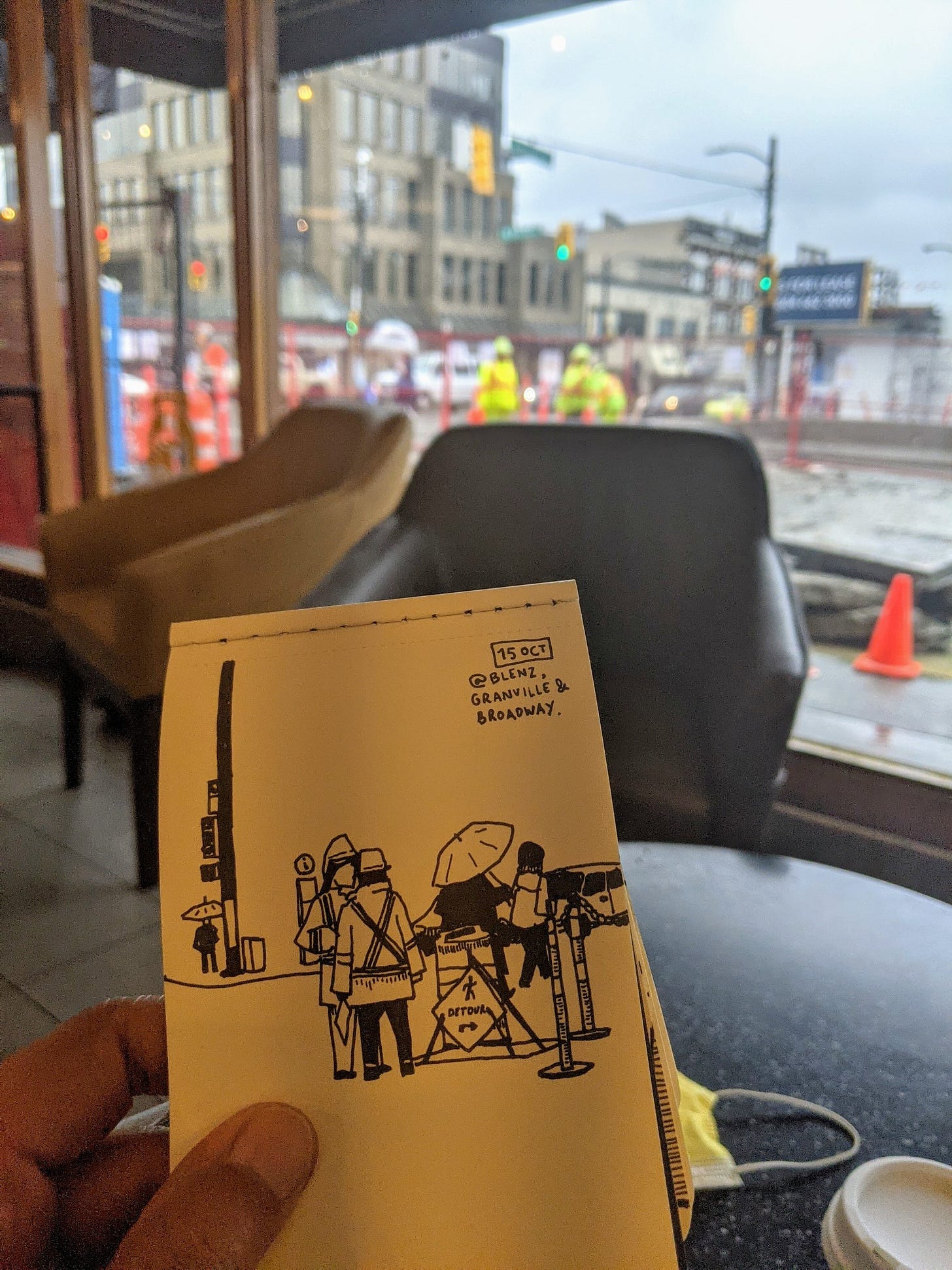On the 15th of October, I went to see some friends’ art exhibit at a local gallery and afterwards stopped at a cafe. Looking out of the window with a steaming cup of coffee in my hands, I noticed a couple of city workers in the rain. They were holding signs to re-direct traffic around a road repair site.