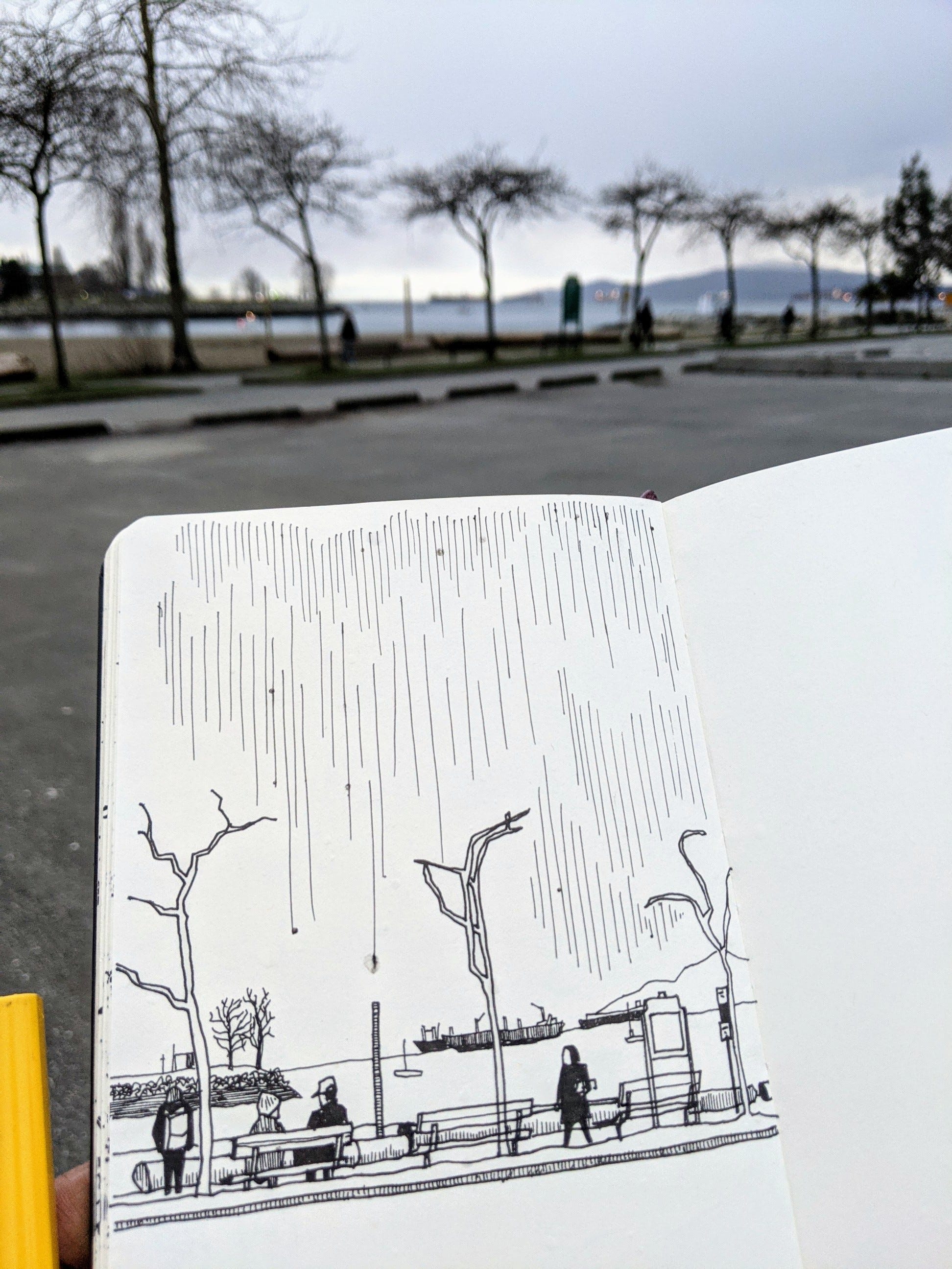 In early March, a drop of water fell on my page right where I drew the rain-drops. I thought about the distance that drop of water had traveled, the oceans or seas or rivers it had been part of, before ending its journey inside the pages of a SneakyArt sketchbook.